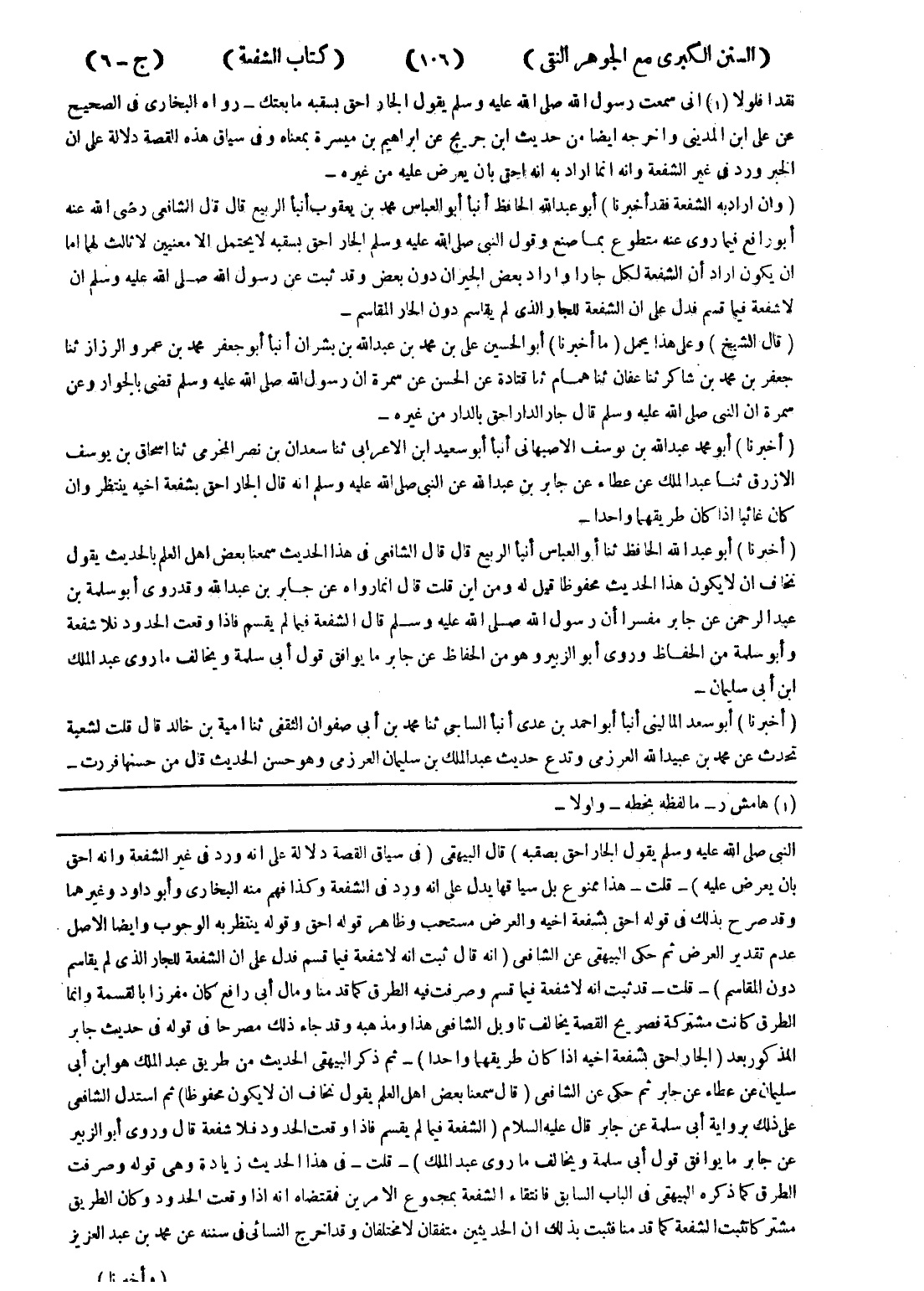 النبي صلى الله عليه وسلم يقول الجار احق بصقبه) قال البيهقى (في سياق القصة دلالة على انه ورد في غير الشفعة وانه احق بان يعرض عليه) - قلت - هذا ممنوع بل سياقها يدل على انه ورد في الشفعة وكذا فهم منه البخاري وأبو داود وغيرهما وقد صرح بذلك في قوله احق بشفعة اخيه والعرض مستحب وظاهر قوله احق وقوله ينتظر به الوجوب وايضا الاصل عدم تقدير العرض ثم حكى البيهقى عن الشافعي (انه قال ثبت انه لا شفعة فيما قسم فدل على ان الشفعة للجار الذى لم يقاسم دون المقاسم) - قلت - قد ثبت انه لا شفعة فيما قسم وصرفت فيه الطرق كما قدمنا ومال أبى رافع كان مفرزا بالقسمة وانما الطرق كانت مشتركة فصريح القصة يخالف تأويل الشافعي هذا ومذهبه وقد جاء ذلك مصرحا في قوله في حديث جابر المذكور بعد (الجار احق بشفعة اخيه إذا كان طريقهما واحدا) - ثم ذكر البيهقى الحديث من طريق عبد الملك هو ابن أبى سليمان عن عطاء عن جابر ثم حكى عن الشافعي (قال سمعنا بعض اهل العلم يقول نخاف ان لا يكون محفوظا) ثم استدل الشافعي على ذلك برواية أبى سلمة عن جابر قال عليه السلام (الشفعة فيما لم يقسم فإذا وقعت الحدود فلا شفعة قال وروى أبو الزبير عن جابر ما يوافق قول أبى سلمة ويخالف ما روى عبد الملك) - قلت - في هذا الحديث زيادة وهى قوله وصرفت الطرق كما ذكره البيهقى في الباب السابق فانتقاء الشفعة بمجموع الامرين فمقتضاه انه إذا وقعت الحدود وكان الطريق مشتركا تثبت الشفعة كما قدمنا فثبت بذلك ان الحديثين متفقان لا مختلفان وقد اخرج النسائي في سننه عن محمد بن عبد العزيز