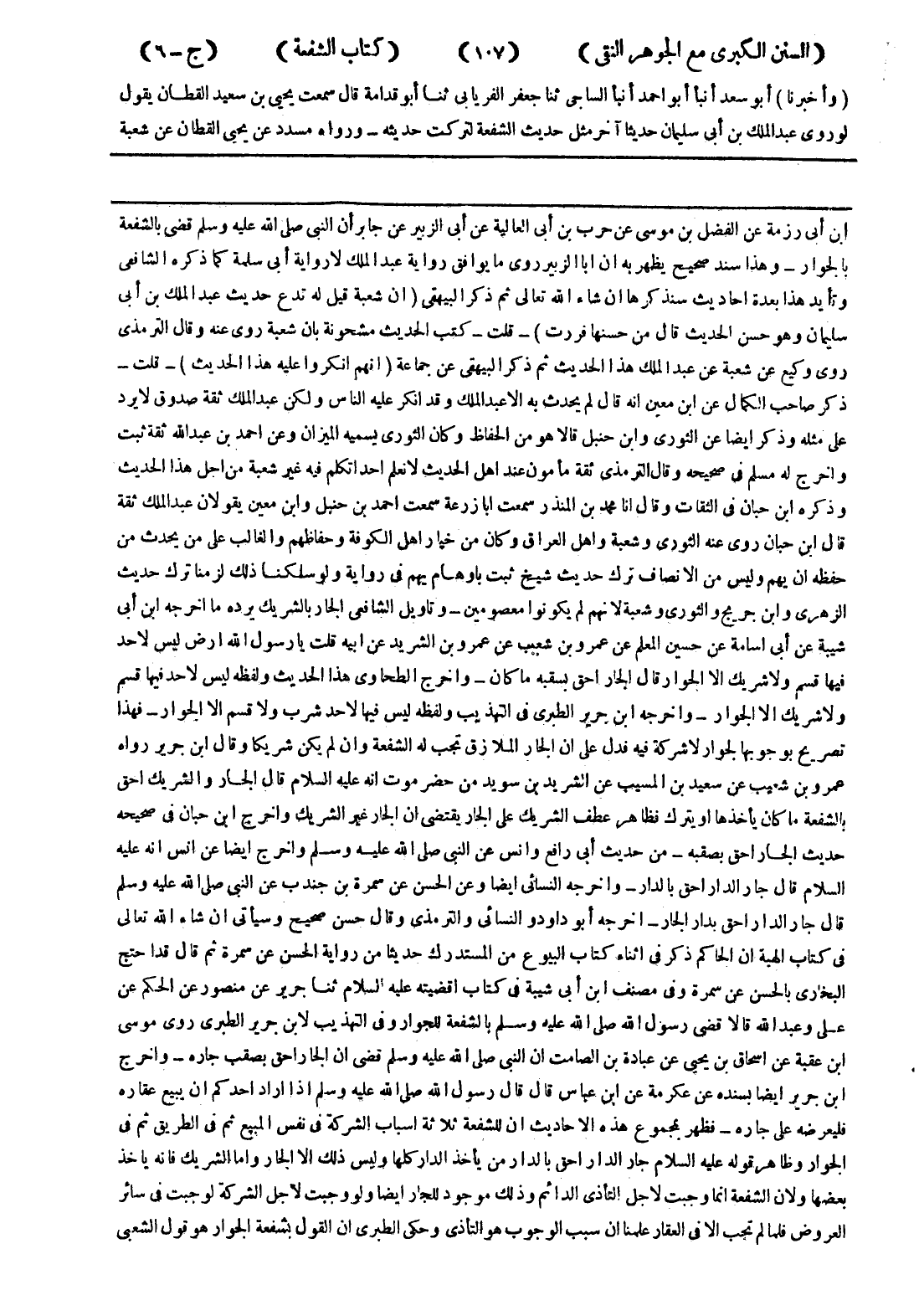 على مثله وذكر ايضا عن الثوري وابن حنبل قالا هو من الحفاظ وكان الثوري يسميه الميزان وعن احمد بن عبد الله ثقة ثبت واخرج لم مسلم في صحيحه وقال الترمذي ثقة مأمون عند اهل الحديث لا نعلم احدا تكلم فيه غير شعبة من اجل هذا الحديث وذكره ابن حبان في الثقات وقال انا محمد بن المنذر سمعت ابا زرعة سمعت احمد بن حنبل وابن معين يقولان عبد الملك ثقة قال ابن حبان روى عنه الثوري وشعبة واهل العراق وكان من خيار اهل الكوفة وحفاظهم والغالب على من يحدث من حفظه ان يهم وليس من الانصاف ترك حديث شيخ ثبت باوهام يهم في رواية ولو سلكنا ذلك لزمنا ترك حديث الزهري وابن جريج والثوري وشعبة لانهم لم يكونوا معصومين - وتاويل الشافعي الجار بالشريك يرده ما اخرجه ابن أبى شيبة عن أبى اسامة عن حسين المعلم عن عمرو بن شعيب عن عمرو بن الشريد عن ابيه قلت يا رسول الله ارض ليس لاحد فيها قسم ولا شريك الا الجوار قال الجار احق بسقبه ما كان - واخرج الطحاوي هذا الحديث ولفظه ليس لاحد فيها قسم ولا شريك الا الجوار - واخرجه ابن جرير الطبري في التهذيب ولفظه ليس فيها لا حد شرب ولا قسم الا الجوار - فهذا تصريح بوجوبها لجوار لا شركة فيه فدل على ان الجار الملازق تجب له الشفعة وان لم يكن شريكا وقال ابن جرير رواه عمرو بن شعيب عن سعيد بن المسيب عن الشريد بن سويد من حضر موت انه عليه السلام قال الجار والشريك احق بالشفعة ما كان يأخذها أو يترك فظاهر عطف الشريك على الجار يقتضى ان الجار غير الشريك واخرج ابن حبان في صحيحه حديث الجار احق بصقبه - من حديث أبى رافع وانس عن النبي صلى الله عليه وسلم واخرج ايضا عن انس انه عليه السلام قال جار الدار احق بالدار - واخرجه النسائي ايضا وعن الحسن عن سمرة بن جندب عن النبي صلى الله عليه وسلم قال جار الدار احق بدار الجار - اخرجه أبو داود النسائي والترمذي وقال حسن صحيح وسيأتى ان شاء الله تعالى في كتاب الهبة ان الحاكم ذكر في اثناء كتاب البيوع من المستدرك حديثا من رواية الحسن عن سمرة ثم قال قد احتج البخاري بالحسن عن سمرة وفى مصنف ابن أبى شيبة في كتاب اقضيته عليه السلام ثنا جرير عن منصور عن الحكم عن على وعبد الله قالا قضى رسول الله صلى الله عليه وسلم بالشفعة للجوار وفى التهذيب لابن جرير الطبري روى موسى ابن عقبة عن اسحاق بن يحيى عن عبادة بن الصامت ان النبي صلى الله عليه وسلم قضى ان الجار احق بصقب جاره - واخرج ابن جرير ايضا بسنده عن عكرمة عن ابن عباس قال قال رسول الله صلى الله عليه وسلم إذا اراد احدكم ان يبيع عقاره فليعرضه على جاره - فظهر بمجموع هذه الاحاديث ان للشفعة ثلاثة اسباب الشركة في نفس المبيع ثم في الطريق ثم في الجوار وظاهر قوله عليه السلام جار الدار احق بالدار من يأخذ الدار كلها وليس ذلك الا الجار واما الشريك فانه ياخذ