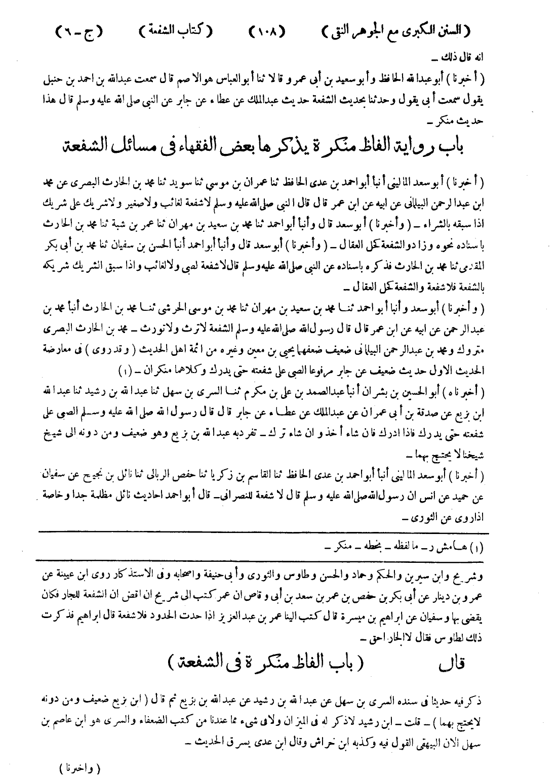 وشريح وابن سيرين والحكم وحماد والحسن وطاوس والثوري وأبى حنيفة واصحابه وفى الاستذكار روى ابن عيينة عن عمرو بن دينار عن أبى بكر بن حفص بن عمر بن سعد بن أبى وقاص ان عمر كتب إلى شريح ان اقض ان الشفعة للجار فكان يقضى بها وسفيان عن ابراهيم بن ميسرة قال كتب الينا عمر بن عبد العزيز إذا حدت الحدود فلا شفعة قال ابراهيم فذكرت ذلك لطاوس فقال لا الجار احق - قال (باب الفاظ منكرة في الشفعة) ذكر فيه حديثا في سنده السرى بن سهل عن عبد الله بن رشيد عن عبد الله بن بزيع ثم قال (ابن بزيع ضعيف ومن دونه لا يحتج بهما) - قلت - ابن رشيد لاذكر له في الميزان ولا في شئ مما عندنا من كتب الضعفاء والسرى هو ابن عاصم بن سهل الان البيهقى القول فيه وكذبه ابن خراش وقال ابن عدى يسرق الحديث -