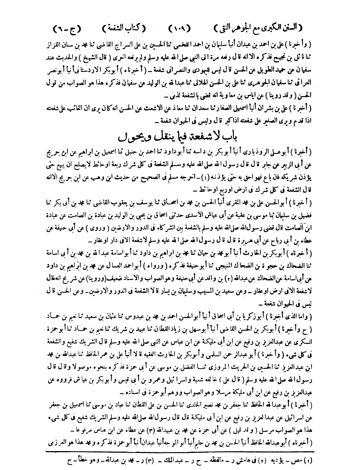 (وروينا) عن شريح انه قال لا شفعة الا في ارض أو عقار - وعن سعيد بن المسيب وسليمان بن يسار قالا الشفعة في الدور والارضين - وعن الحسن قال ليس في الحيوان شفعة - (واما الذى أخبرنا) أبو زكريا بن أبى اسحاق أنبأ أبو الحسن احمد بن محمد بن عبدوس ثنا عثمان بن سعيد ثنا نعيم بن حماد
