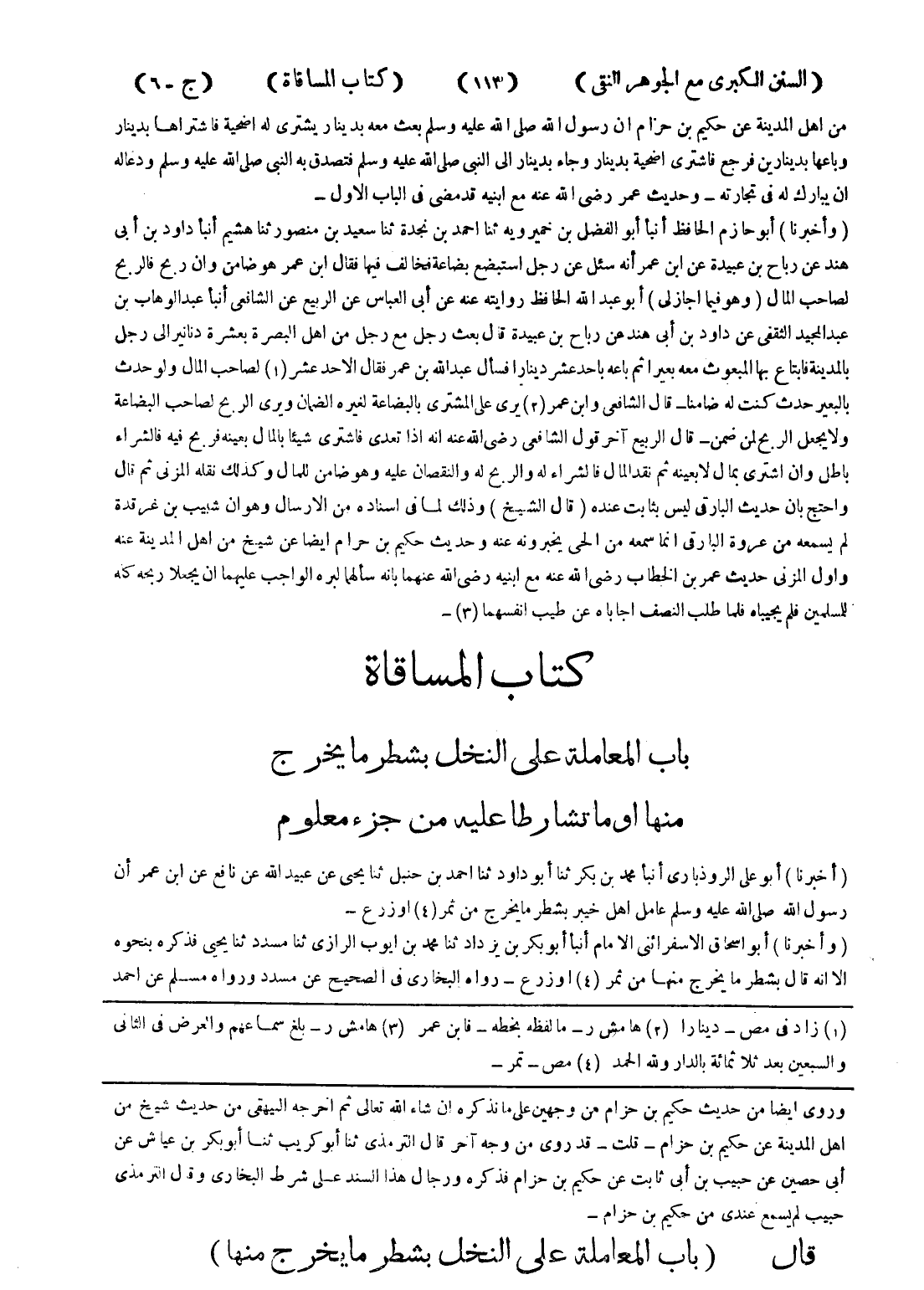 وروى ايضا من حديث حكيم بن حزام من وجهين على ما نذكره ان شاء الله تعالى ثم اخرجه البيهقى من حديث شيخ من اهل المدينة عن حكيم بن حزام - قلت - قد روى من وجه آخر قال الترمذي ثنا أبو كريب ثنا أبو بكر بن عياش عن أبي حصين عن حبيب بن أبي ثابت عن حكيم بن حزام فذكره ورجال هذا السند على شرط البخاري وقال الترمذي حبيب لم يسمع عندي من حكيم بن حزام - قال (باب المعاملة على النخل بشطر ما يخرج منها)