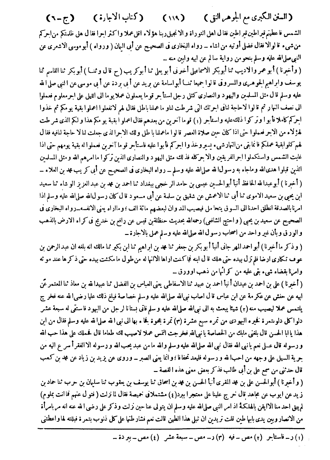 ابن يحيى بن سعيد الاموى ثنا ابى ثنا الاعمش عن شقيق بن سلمة عن ابى مسعود قال كان رسول الله صلى الله عليه وسلم إذا امرنا بالصدقة انطلق احدنا إلى السوق يتحامل فيصيب المدوان لبعضهم مائة الف وما اراه يعنى الا نفسه - رواه البخاري في الصحيح عن سعيد بن يحيى (واحتج الشافعي) رحمه الله بحديث حنظلة بن قيس عن رافع بن خديج في كراء الارض بالذهب والورق وبأن غير واحد من اصحاب رسول الله صلى الله عليه وسلم عمل بالاجارة - (وذكر ما أخبرنا) أبو احمد المهرجانى أنبأ أبو بكر بن جعفر ثنا محمد بن ابراهيم ثنا ابن بكير ثنا مالك انه بلغه ان عبد الرحمن بن عوف تكارى ارضا فلم تزل بيده حتى هلك قال ابنه فما كنت اراها الا انها له من طول ما مكثت بيده حتى ذكرها عند موته وامرنا بقضاء شئ بقى عليه من كرائها من ذهب أو ورق