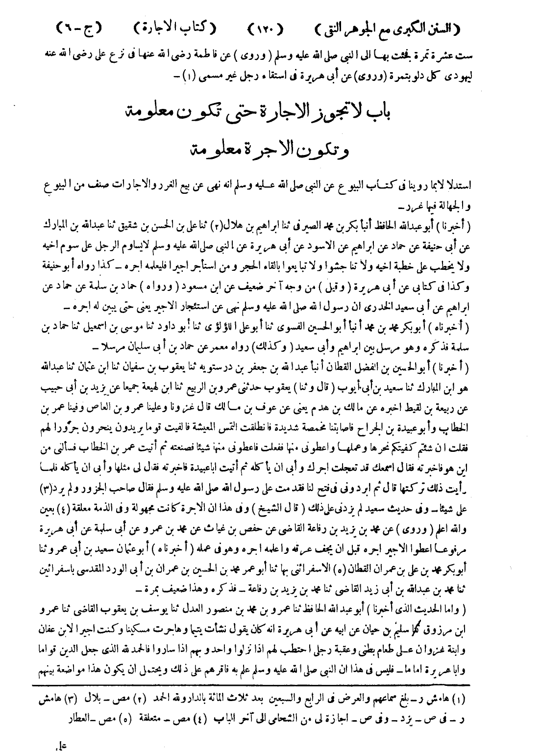 - (أخبرنا) أبو عبد الله الحافظ أنبأ بكربن محمد الصيرفى ثنا ابراهيم بن هلال (2) ثنا على بن الحسن بن شقيق ثنا عبد الله بن المبارك عن أبى حنيفة عن حماد عن ابراهيم عن الاسود عن أبى هريرة عن النبي صلى الله عليه وسلم لا يساوم الرجل على سوم اخيه ولا يخطب على خطبة اخيه ولا تناجشوا ولا تبايعوا بالقاء الحجر ومن استأجر اجيرا فليعلمه اجره - كذا رواه أبو حنيفة وكذا في كتابي عن ابى هريرة (وقيل) من وجه آخر ضعيف عن ابن مسعود (ورواه) حماد بن سلمة عن حماد عن ابراهيم عن أبى سعيد الخدرى ان رسول الله صلى الله عليه وسلم نهى عن استئجار الاجير يعنى حتى يبين له اجره - (أخبرناه) أبو بكر محمد بن محمد أنبأ أبو الحسين الفسوى ثنا أبو على اللؤلؤي ثنا أبو داود ثنا موسى بن اسمعيل ثنا حماد بن سلمة فذكره وهو مرسل بين ابراهيم وأبى سعيد (وكذلك) رواه معمر عن حماد بن أبى سليمان مرسلا