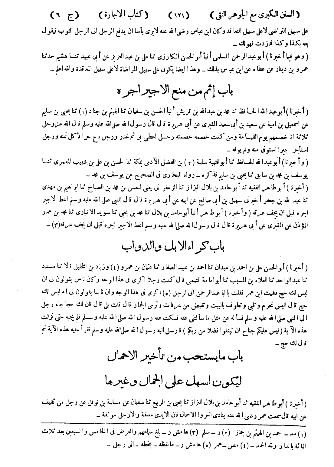 - باب كراء الابل والدواب أحبرنا أبو الحسن على بن احمد عبدان ثنا احمد بن عبيد الصفار ثنا عثمان بن عمرو (4) وزياد بن الخليل قالا ثنا مسدد ثنا عبد الواحد ثنا العلاء بن المسيب ثنا أبو أمامة التيمى قال كنت رجلا اكرى في هذا الوجه وكان ناس يقولون لى ان ليس لك حج فلقيت ابن عمر فقلت يا ابا عبد الرحمن انى لرجل (5) اكرى في هذا الوجه وان ناسا يقولون لى انه ليس لك حج قال اليس تحرم وتلبي وتطوف بالبيت وتفيض من عرفات وترمى الجمار قال قلت بلى قال فان لك حجا جاء رجل إلى النبي صلى الله عليه وسلم فسأله عن مثل ما سألتنى عنه فسكت عنه رسول الله صلى الله عليه وسلم فلم يجبه حتى نزلت هذه الآية (ليس عليكم جناح ان تبتغوا فضلا من ربكم) فارسل إليه رسول الله صلى الله عليه وسلم فقرأ عليه هذه الآية ثم قال لك حج