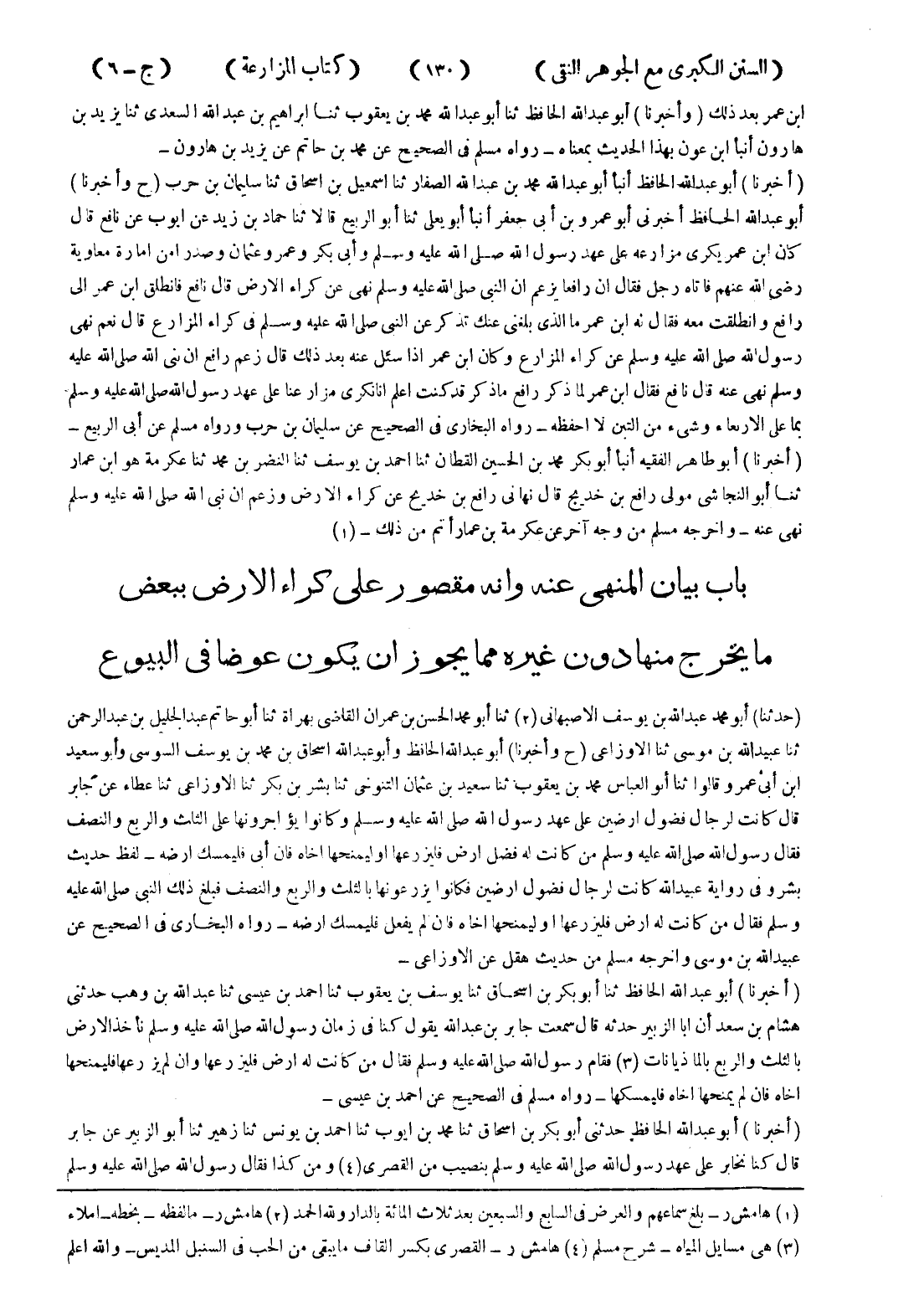 (ح وأخبرنا) أبو عبد الله الحافظ وأبو عبد الله اسحاق بن محمد بن يوسف السوسى وأبو سعيد ابن أبى عمرو قالوا ثنا أبو العباس محمد بن يعقوب ثنا سعيد بن عثمان التنوخى ثنا بشر بن بكر ثنا الاوزاعي ثنا عطاء عن جابر قال كانت لرجال فضول ارضين على عهد رسول الله صلى الله عليه وسلم وكانوا يؤاجرونها على الثلث والربع والنصف فقال رسول الله صلى الله عليه وسلم من كانت له فضل ارض فليزرعها أو ليمنحها اخاه فان أبى فليمسك ارضه - لفظ حديث بشر وفى رواية عبيد الله كانت لرجال فضول ارضين فكانوا يزرعونها بالثلث والربع والنصف فبلغ ذلك النبي صلى الله عليه وسلم فقال من كانت له ارض فليرزعها أو ليمنحها اخاه فان لم يفعل فليمسك ارضه - رواه البخاري في الصحيح عن عبيد الله بن موسى واخرجه مسلم من حديث هقل عن الاوزاعي