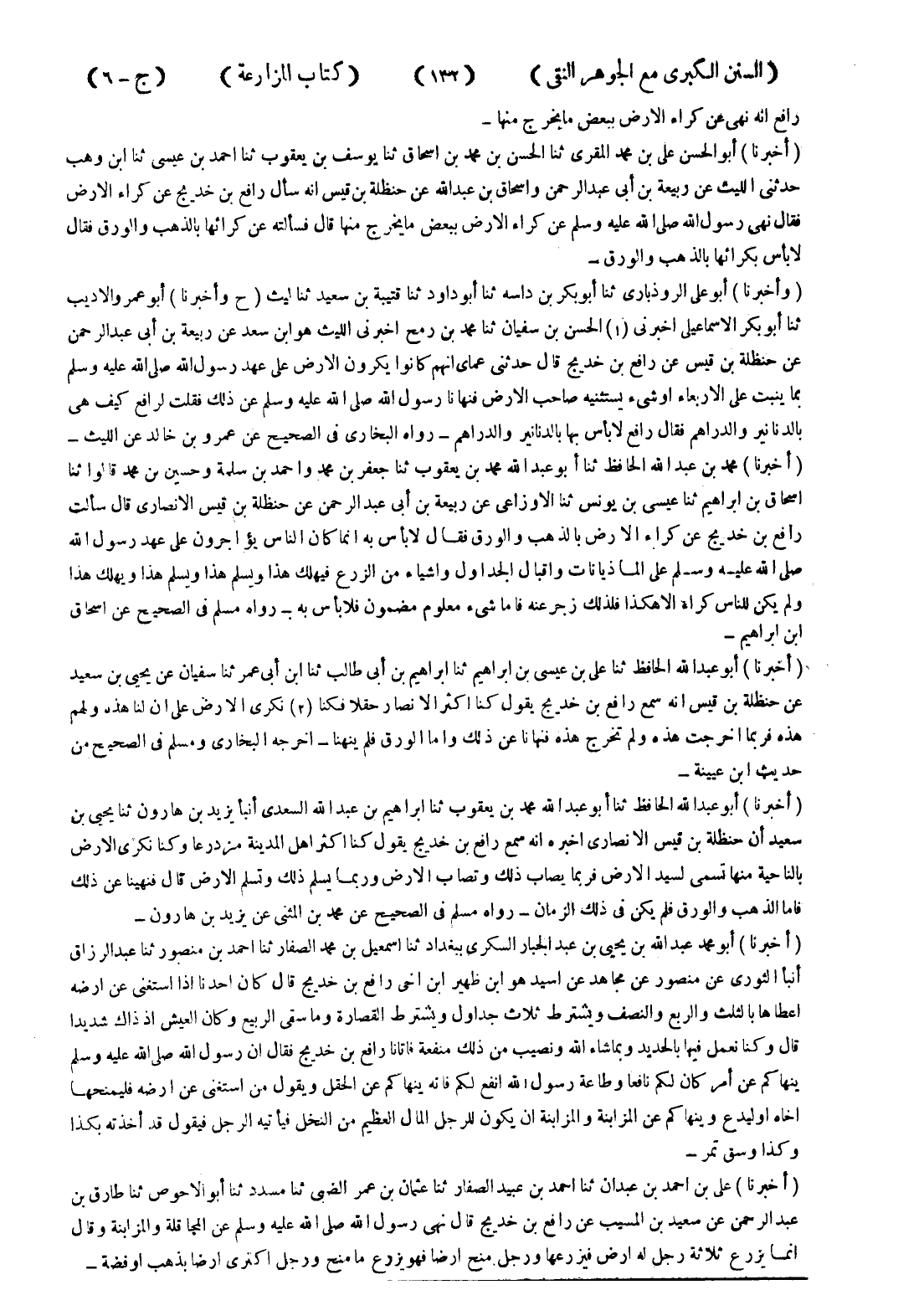 - (أخبرنا) أبو عبد الله الحافظ ثنا أبو عبد الله محمد بن يعقوب ثنا ابراهيم بن عبد الله السعدى أنبأ يزيد بن هارون ثنا يحيى بن سعيد أن حنظلة بن قيس الانصاري اخبره انه سمع رافع بن خديج يقول كنا اكثر اهل المدينة مزدرعا وكنا نكرى الارض بالناحية منها تسمى لسيد الارض فربما يصاب ذلك وتصاب الارض وربما يسلم ذلك وتسلم الارض قال فنهينا عن ذلك فاما الذهب والورق فلم يكن في ذلك الزمان - رواه مسلم في الصحيح عن محمد بن المثنى عن يزيد بن هارون
