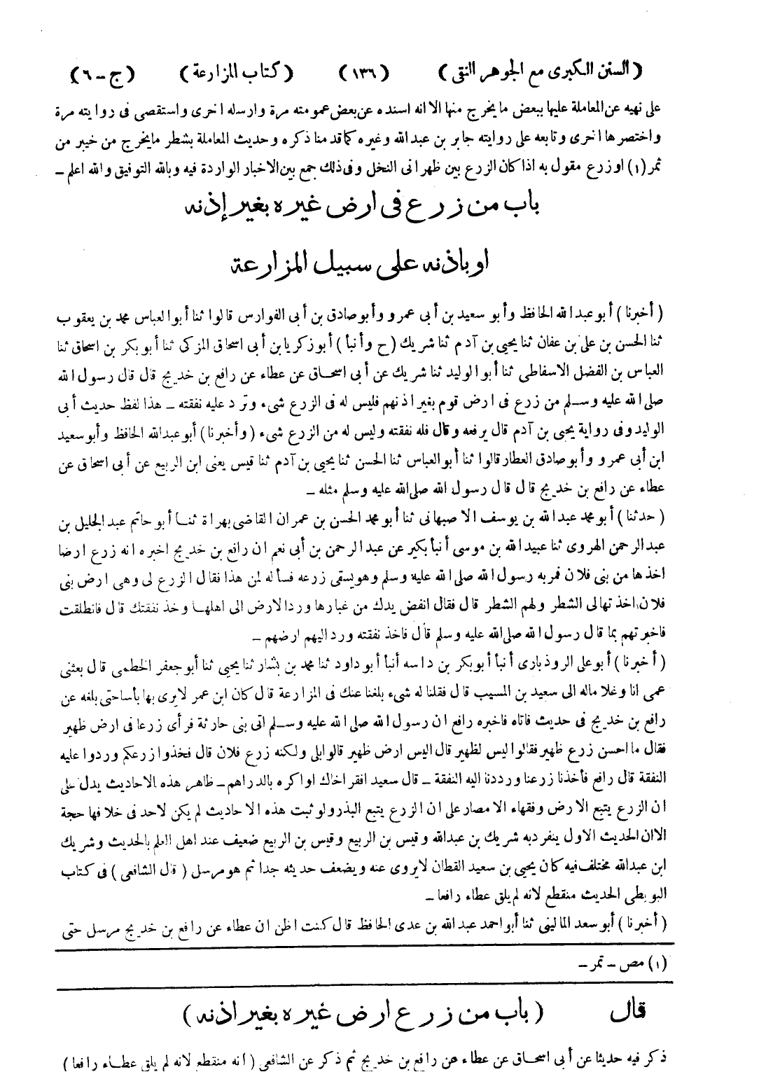قال (باب من زرع ارض غيره بغير اذنه) ذكر فيه حديثا عن أبى اسحاق عن عطاء عن رافع بن خديج ثم ذكر عن الشافعي (انه منقطع لانه لم يلق عطاء رافعا)