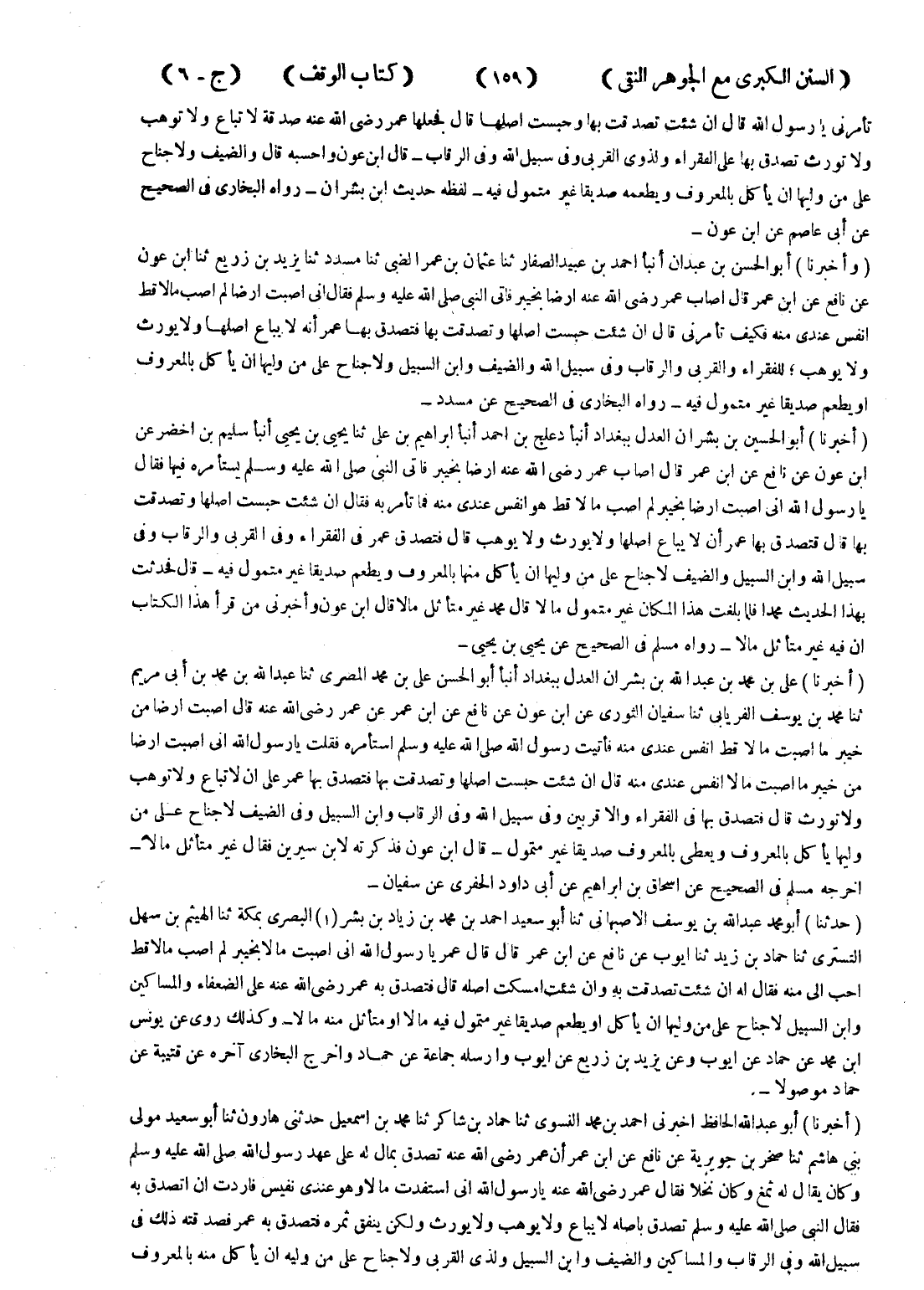 تأمرني يارسول الله قال ان شئت تصدقت بها وحبست اصلها قال فجعلها عمر رضى الله عنه صدقة لا تباع ولا توهب ولا تورث تصدق بها على الفقراء ولذوى القربى وفى سبيل الله وفى الرقاب - قال ابن عون واحسبه قال والضيف ولا جناح على من وليها ان يأكل بالمعروف ويطعمه صديقا غير متمول فيه - لفظه حديث ابن بشران - رواه البخاري في الصحيح عن أبى عاصم عن ابن عون (وأخبرنا) أبو الحسن بن عبدان أنبأ احمد بن عبيد الصفار ثنا عثمان بن عمر الضبي ثنا مسدد ثنا يزيد بن زريع ثنا ابن عون عن نافع عن ابن عمر قال اصاب عمر رضى الله عنه ارضا بخيبر فأتى النبي صلى الله عليه وسلم فقال انى اصبت ارضا لم اصب مالا قط انفس عندي منه فكيف تأمرني قال ان شئت حبست اصلها فتصدقت بها فتصدق بها عمر أنه لا يباع اصلها ولا يورث ولا يوهب ، للفقراء والقربى والرقاب وفى سبيل الله والضيف وابن السبيل ولا جناح على من وليها ان يأكل بالمعروف أو يطعم صديقا غير متمول فيه - رواه البخاري في الصحيح عن مسدد