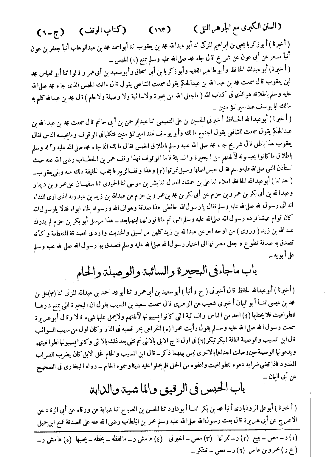 - (أخبرنا) أبو عبد الله الحافظ وأبو طاهر الفقيه وأبو زكريا بن أبى اسحاق وأبو سعيد بن أبى عمرو قالوا ثنا أبو العباس محمد ابن يعقوب قال سمعت محمد بن عبد الله بن عبد الحكم يقول سمعت الشافعي يقول قال مالك الحبس الذى جاء محمد صلى الله عليه وسلم باطلاقه هو الذى في كتاب الله (ما جعل الله من بحيرة ولا سائبة ولا وصيلة ولا حام) قال محمد بن عبد الله كلم به مالك ابا يوسف عند امير المؤمنين