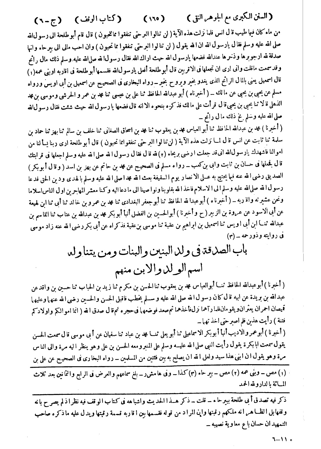 ذكر فيه تصدق أبى طلحة ببيرحاء - قلت ذكر هذا الحديث واشباهه في كتاب الوقف فيه نظر إذ لم يصرح بانه وقفها بل الظاهر انه ملكهم رقبتها وإن المراد من قوله فقسمها بين اقاربه قسمة رقبتها ويدل عليه ما ذكره صاحب التمهيد ان حسان باع معاوية نصيبه -