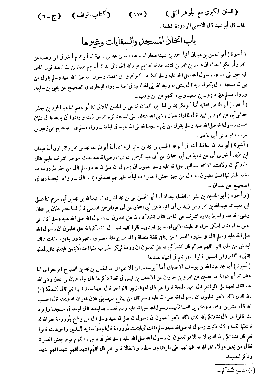 - (أخبرنا) أبو طاهر الفقيه أنبا أبو بكر محمد بن الحسين القطان ثنا على بن الحسن الهلالي ثنا أبو عاصم ثنا عبد الحميد بن جعفر حدثنى أبى عن محمود بن لبيد قال لما اراد عثمان رضى الله عنه ان يبنى المسجد كره الناس ذلك وارادو ا أن يدعه فقال عثمان سمعت رسول الله صلى الله عليه وسلم يقول من بنى مسجدا لله بنى الله له بيتا في الجنة - رواه مسلم في الصحيح عن زهير بن حرب وغيره عن أبى عاصم