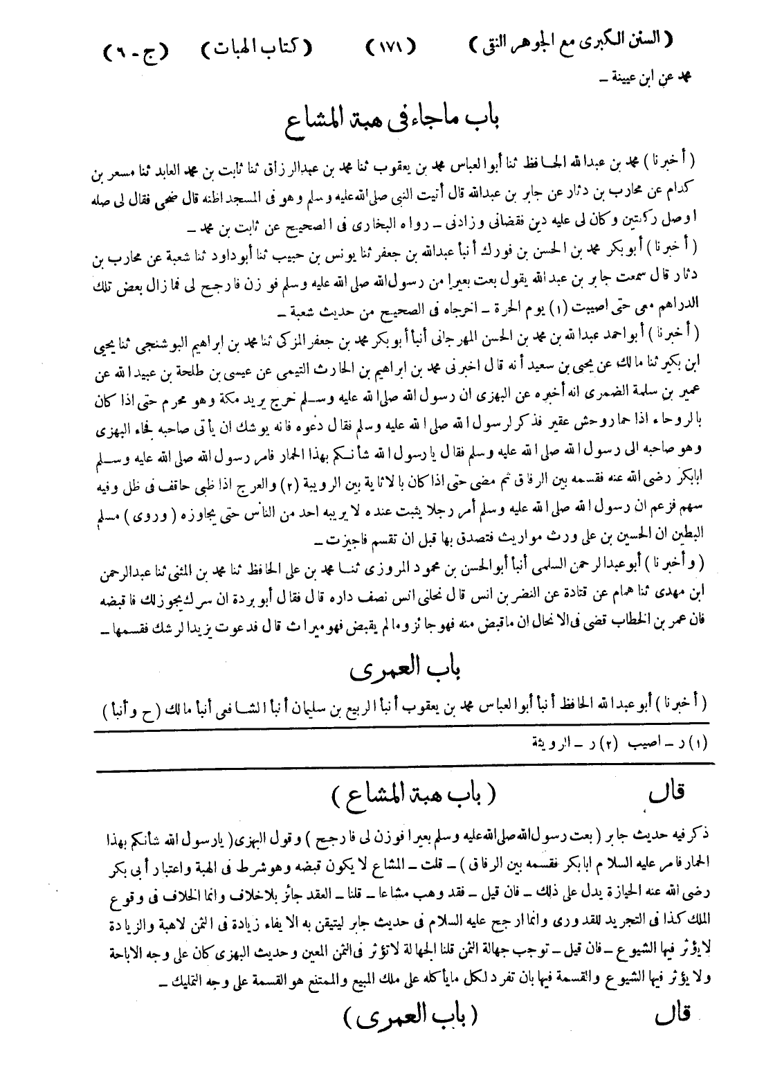 قال (باب هبة المشاع) ذكر فيه حديث جابر (بعت رسول الله صلى الله عليه وسلم بعيرا فوزن لى فارجح) وقول البهزى (يا رسول الله شأنكم بهذا الحمار فامر عليه السلام ابا بكر فقسمه بين الرفاق) - قلت - المشاع لا يكون قبضه وهو شرط في الهبة واعتبار أبى بكر رضى الله عنه الحيازة يدل على ذلك - فان قيل - فقد وهب مشاعا - قلنا - العقد جائز بلا خلاف وانما الخلاف في وقوع الملك كذا في التجريد للقدورى وانما ارجح عليه السلام في حديث جابر ليتيقن به الايفاء زيادة في الثمن لاهبة والزيادة لا يؤثر فيها الشيوع - فان قيل - توجب جهالة الثمن قلنا الجهالة لا تؤثر في الثمن المعين وحديث البهزى كان على وجه الاباحة ولا يؤثر فيها الشيوع والقسمة فيها بان تفرد لكل ما يأكله على ملك المبيع والممتنع هو القسمة على وجه التمليك - قال (باب العمرى)