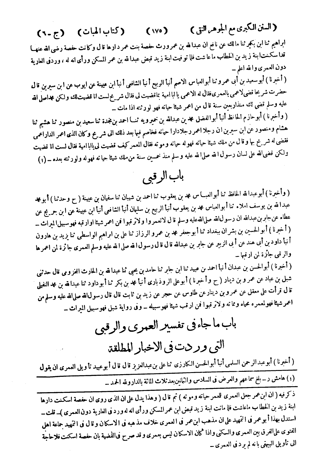 ذكر فيه (ان ابن عمر جعل العمرى للمعمر حياته وموته) ثم قال (وهذا يدل على ان الذى روى ان حفصة اسكنت دارها ابنة زيد بن الخطاب ما عاشت فلما ماتت ابنة زيد قبض ابن عمر المسكن ورأى انه له ورد في العارية دون العمرى) - قلت -