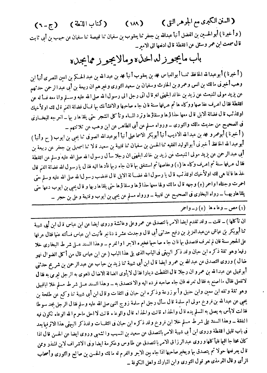 ان تأكلها) - قلت - وقد تقدم ايضا الامر بالتصدق عن عمرو على وعائشة وروى ايضا عن ابن عباس قال ابن أبى شيبة ثنا أبو بكر بن عياش عن عبد العزيز بن رفيع حدثنى أبى قال وجدت عشرة دنانير فأتيت ابن عباس فسألته عنها فقال عرفها على الحجر سنة فان لم تعرف فتصدق بها فان جاء صاحبها فخيره الاجر أو الغرم - وهذا السند على شرط البخاري خلا رفيعا وهو ثقة ذكره ابن حبان وقد ذكر البيهقى في الباب الذى يلى هذا الباب (عن ابن عباس قال من أكل الضوال فهو ضال) وروى التصدق عن عبد الله بن عمرو ايضا قال ابن أبى شيبة ثنا زيد بن حباب عن عبد الرحمن بن شريح حدثنى أبو قبيل عن عبد الله بن عمرو ان رجلا قال التقطت دينارا فقال لا يأوى الضالة الاضال؟؟؟ به الرجل ليرمى به فقال لا تفعل فقال ما اصنع به فقال تعرفه فان جاء صاحبه فرده إليه والا فتصدق به - وهذا السند على شرط مسلم خلا ابا قبيل وهو ثقة وثقه ابن معين وابن حنبل وأبو زرعة وذكره ابن حبان في الثقات وقال ابن أبى شيبة ثنا وكيع عن طلحة بن يحيى عن عبد الله بن فروخ مولى ام سلمة قال سأل رجل ام سلمة زوج النبي صلى الله عليه وسلم فقال الرجل يجد سوطا فقالت لا بأس به يصل به المسلم يده قال والحذاء قالت والحذاء قال والوعاء قالت لا احل ما حرم الله الوعاء تكون فيه النفقة - وهذا السند على شرط مسلم خلا ابن فروخ وقد ذكره ابن حبان في الثقات وقد ذكر البيهقى هذا الاثر فيما بعد