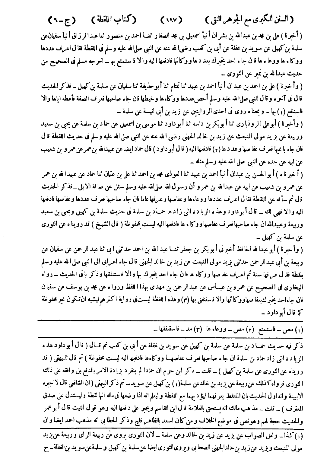 ذكر فيه حديث حماد بن سلمة عن سلمة بن كهيل عن سويد بن غفلة عن أبى بن كعب ثم قال (قال أبو داود هذه الزيادة التى زاد حما بن سلمة ان جاء صاحبها فعرف عفاصها ووكاءها فادفعها إليه ليست محفوظة) ثم قال البيهقى (قد رويناه عن الثوري عن سلمة بن كهيل) - قلت - ذكر ابن حزم ان حمادا لم ينفرد بزيادة الامر بالدفع بل وافقه على ذلك الثوري فرواه كذلك عن ربيعة عن يزيد بن خالد عن سلمة (1) بن كهيل عن سويد - ثم ذكر البيهقى (ان الشافعي قال لا اجبره الا ببينة وانه اول الحديث بان الملتقط يعرفهما ليؤديهما مع اللقطة وليعلم انه إذا وضعها في ماله انها لقطة وليستدل على صدق المعترف) - قلت - مذهب مالك انه يستحق بالعلامة قال ابن القاسم ويجبر على دفعها إليه وهو قول الليث قال أبو عمر