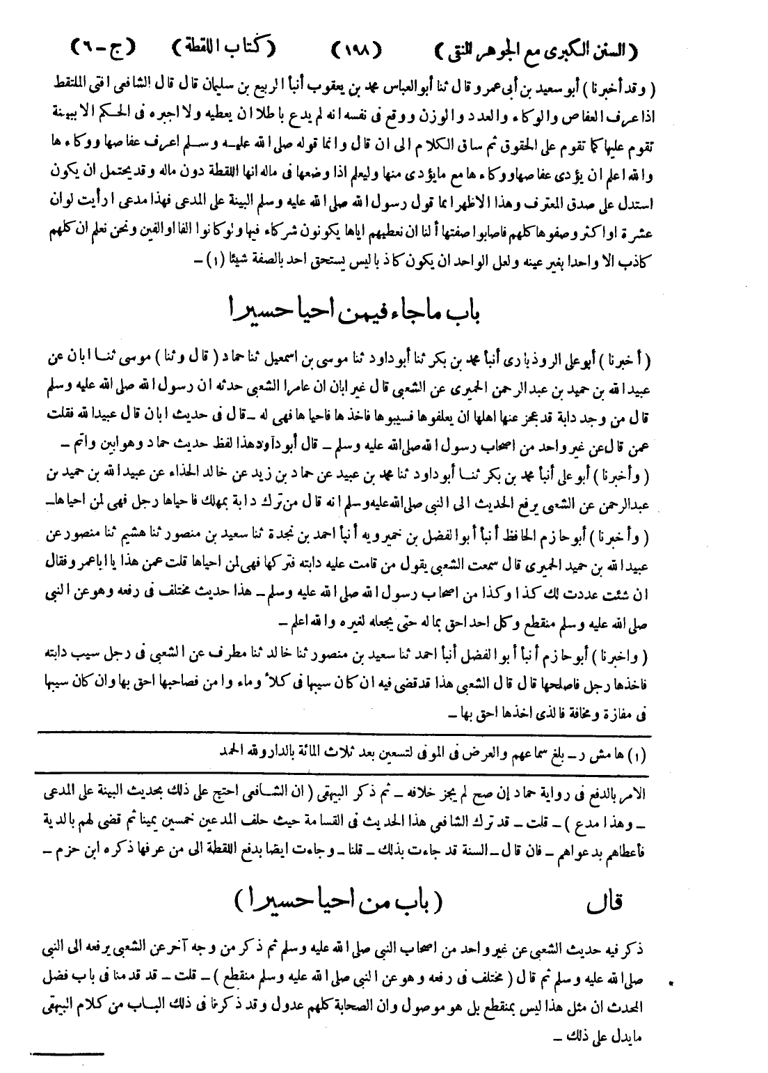 الامر بالدفع في رواية حماد إن صح لم يجز خلافه - ثم ذكر البيهقى (ان الشافعي احتج على ذلك بحديث البينة على المدعى - وهذا مدع) - قلت - قد ترك الشافعي هذا الحديث في القسامة حيث حلف المدعين خمسين يمينا ثم قضى لهم بالدية فأعطاهم بدعواهم - فان قال - السنة قد جاءت بذلك - قلنا - وجاءت ايضا بدفع اللقطة إلى من عرفها ذكره ابن حزم - قال (باب من احيا حسيرا) ذكر فيه حديث الشعبى عن غير واحد من اصحاب النبي صلى الله عليه وسلم ثم ذكر من وجه آخر عن الشعبى يرفعه إلى النبي صلى الله عليه وسلم ثم قال (مختلف في رفعه وهو عن النبي صلى الله عليه وسلم منقطع) - قلت - قد قدمنا في باب فضل المحدث ان مثل هذا ليس بمنقطع بل هو موصول وان الصحابة كلهم عدول وقد ذكرنا في ذلك الباب من كلام البيهقى ما يدل على ذلك -