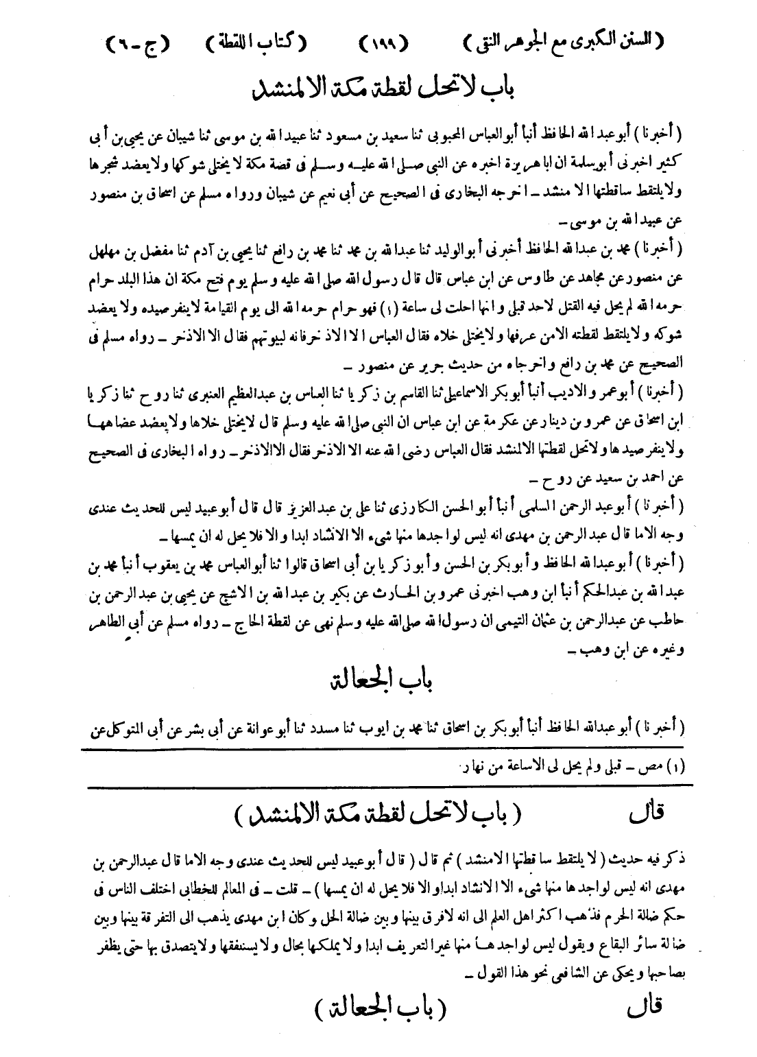 قال (باب لا تحل لقطة مكة الا لمنشد) ذكر فيه حديث (لا يلتقط ساقطتها الا منشد) ثم قال (قال أبو عبيد ليس للحديث عندي وجه الا ما قال عبد الرحمن بن مهدى انه ليس لواجدها منها شئ الا الانشاد ابدا والا فلا يحل له ان يمسها) - قلت - في المعالم للخطابي اختلف الناس في حكم ضللة الحرم فذهب اكثر اهل العلم إلى انه لا فرق بينها وبين ضالة الحل وكان ابن مهدى يذهب إلى التفرقة بينها وبين ضالة سائر البقاع ويقول ليس لواجدها منها غير التعريف ابدا ولا يملكها بحال ولا يستنفقها ولا يتصدق بها حتى يظفر بصاحبها ويحكى عن الشافعي نحو هذا القول - قال (باب الجعالة)