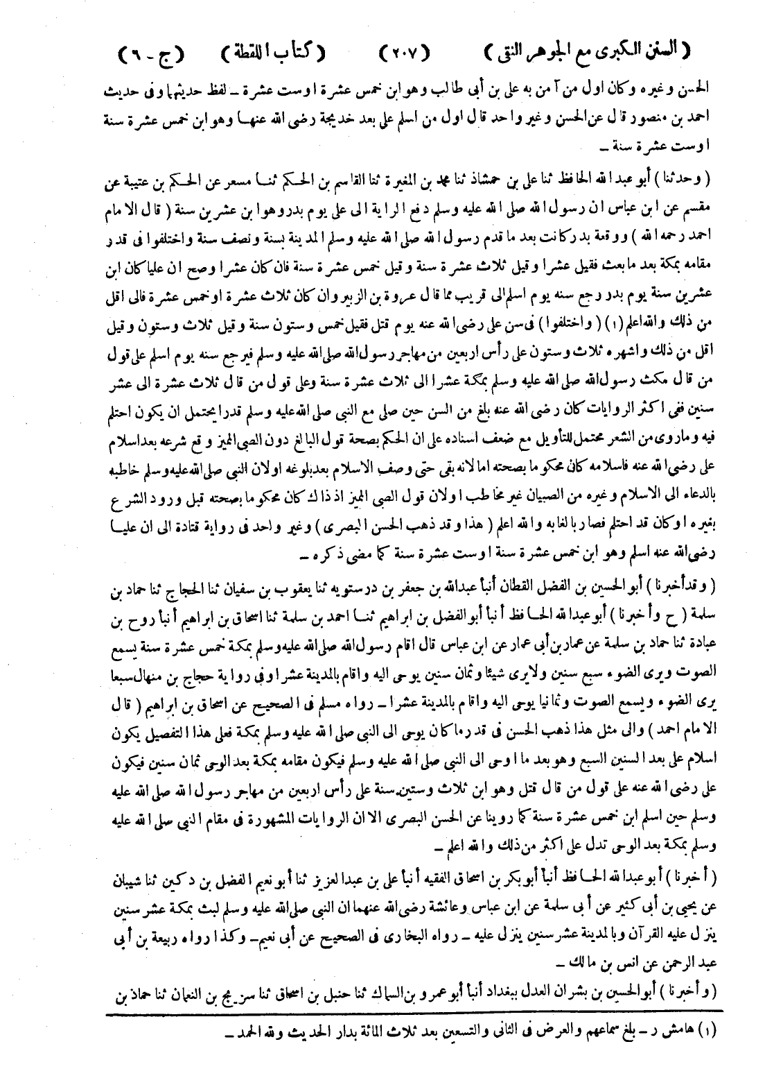 (ح وأخبرنا) أبو عبد الله الحافظ أنبأ أبو الفضل بن ابراهيم ثنا أحمد بن سلمة ثنا إسحاق بن ابراهيم أنبأ روح بن عبادة ثنا حماد بن سلمة عن عمار بن أبى عمار عن ابن عباس قال اقام رسول الله صلى الله عليه وسلم بمكة خمس عشرة سنة يسمع الصوت ويرى الضوء سبع سنين ولايرى شيئا وثمان سنين يوحى إليه واقام بالمدينة عشر اوفى رواية حجاج بن منهال سبعا يرى الضوء ويسمع الصوت وثمانيا يوحى إليه واقام بالمدينة عشرا - رواه مسلم في الصحيح عن اسحاق بن ابراهيم (قال الإمام احمد) والى مثل هذا ذهب الحسن في قدر ما كان يوحى إلى النبي صلى الله عليه وسلم بمكة فعلى هذا التفصيل يكون اسلام على بعد السنين السبع وهو بعدما اوحى إلى النبي صلى الله عليه وسلم فيكون مقامه بمكة بعد الوحى ثمان سنين فيكون على رضى الله عنه على قول من قال قتل وهو ابن ثلاث وستين سنة على رأس اربعين من مهاجر رسول الله صلى الله عليه وسلم حين اسلم ابن خمس عشرة سنة كما روينا عن الحسن البصري الا ان الروايات المشهورة في مقام النبي صلى الله عليه وسلم بمكة بعد الوحى تدل على اكثر من ذلك والله اعلم