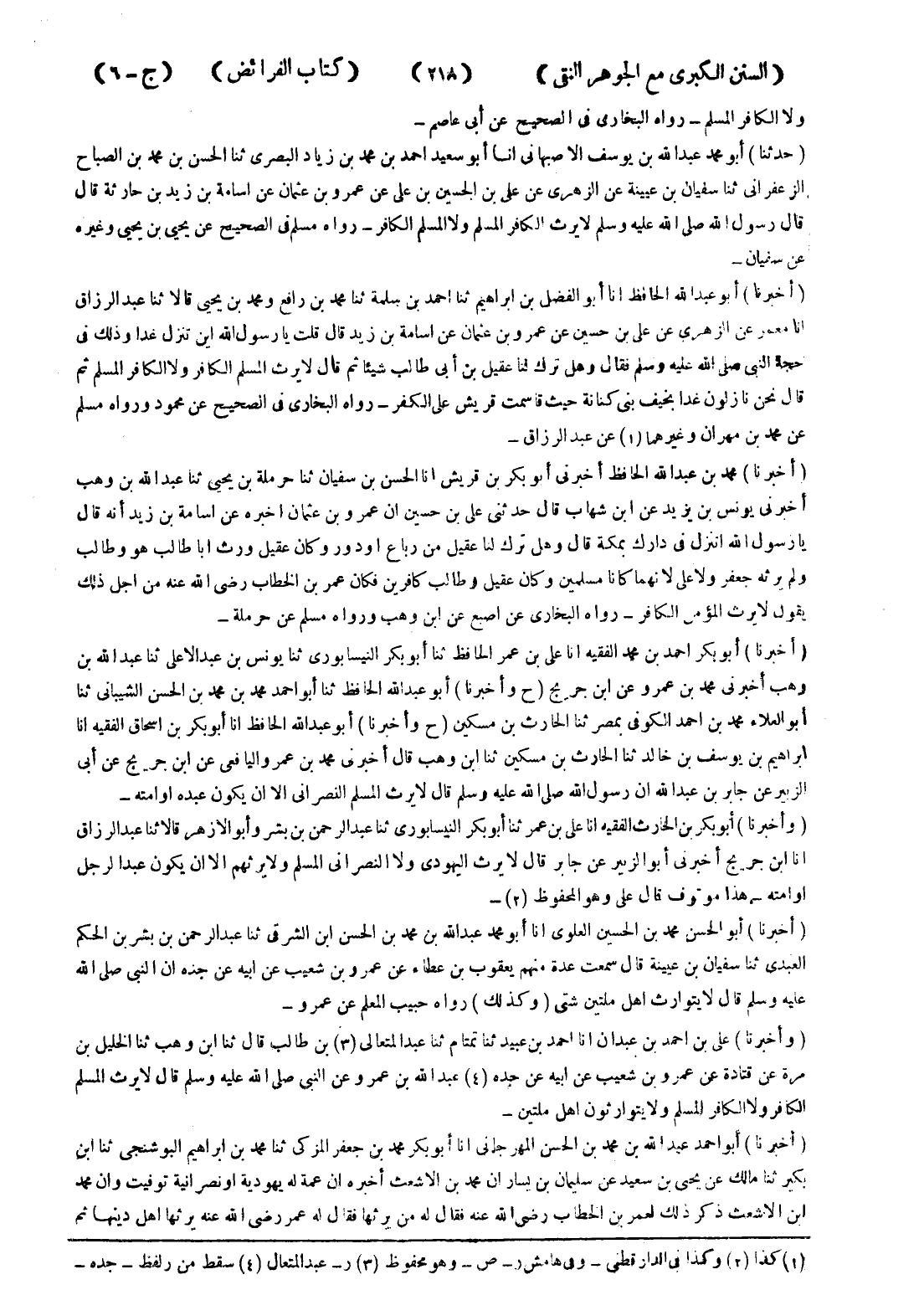 - (أخبرنا) محمد بن عبد الله الحافظ أخبرني أبو بكر بن قريش انا الحسن بن سفيان ثنا حرملة بن يحيى ثنا عبد الله بن وهب أخبرني يونس بن يزيد عن ابن شهاب قال حدثنى على بن حسين ان عمرو بن عثمان اخبره عن اسامة بن زيد أنه قال يا رسول الله انزل في دارك بمكة قال وهل ترك لنا عقيل من رباع أو دور وكان عقيل ورث ابا طالب هو وطالب ولم يرثه جعفر ولا على لا نهما كانا مسلمين وكان عقيل وطالب كافرين فكان عمربن الخطاب رضى الله عنه من اجل ذلك يقول لا يرث المؤمن الكافر - رواه البخاري عن اصبع عن ابن وهب ورواه مسلم عن حرملة