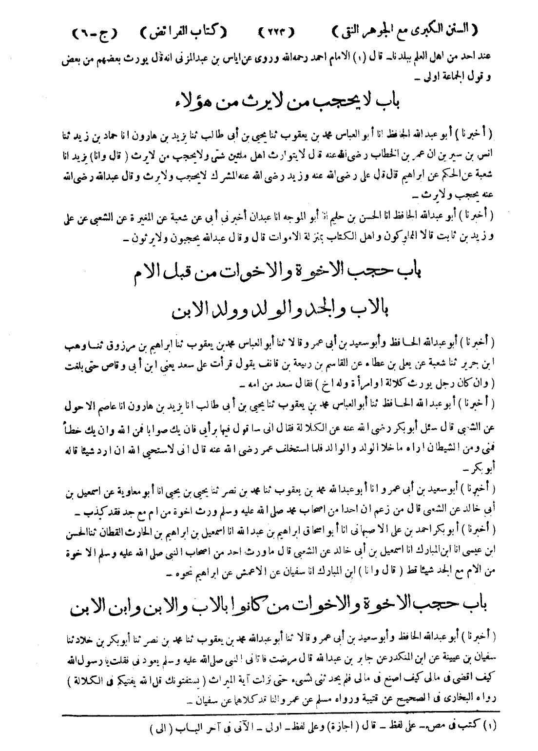 (أخبرنا) أبو عبد الله الحافظ انا أبو العباس محمد بن يعقوب ثنا يحيى بن أبى طالب ثنا يزيد بن هارون انا حماد بن زيد ثنا انس بن سيرين ان عمربن الخطاب رضى الله عنه قال لا يتوارث اهل ملتين ؟ شتى ؟ ولا يحجب من لا يرث (قال وانا) يزيد انا شعبة عن الحكم عن ابراهيم قال قال على رضى الله عنه وزيد رضى الله عنه المشرك لا يحجب ولا يرث وقال عبد الله رضى الله عنه يحجب ولا يرث