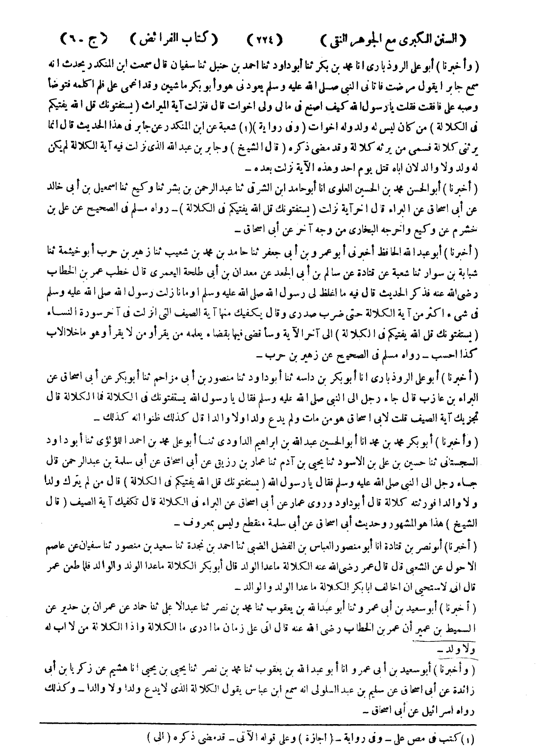(وأخبرنا) أبو على الروذبارى انا محمد بن بكر ثنا أبو داود ثنا احمد بن حنبل ثنا سفيان قال سمعت ابن المنكدر يحدث انه سمع جابرا يقول مرضت فأتاني النبي صلى الله عليه وسلم يعودني هو وأبو بكر ما شيين وقد اغمى على فلم اكلمه فتوضأ وصبه على فافقت فقلت يار سول الله كيف اصنع في مالى ولى اخوات قال فنزلت آية الميراث (يستفتونك قل الله يفتيكم في الكلالة) من كان ليس له ولد وله اخوات (وفى رواية) (1) شعبة عن ابن المنكدر عن جابر في هذا الحديث انما