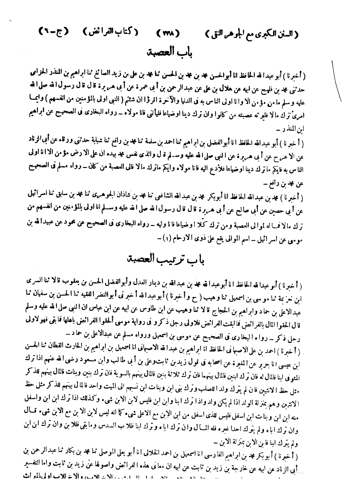 - (أخبرنا) محمد بن عبد الله الحافظ أبو بكر محمد بن عبد الله الشافعي ثنا محمد بن شاذان الجوهرى ثنا محمد بن سابق ثنا اسرائيل عن أبى حصين عن أبى صالح عن أبى هريرة قال قال رسول الله صلى الله عليه وسلم انا اولى بالمؤمنين من انفسهم من ترك مالا فماله لموالى العصبة ومن ترك كلا أو ضياعا فانا وليه - رواه البخاري في الصحيح عن محمود عن عبيد الله بن موسى عن اسرائيل - اسم الموالى يقع على ذوى الارحام - (1) باب تر تيب العصبة