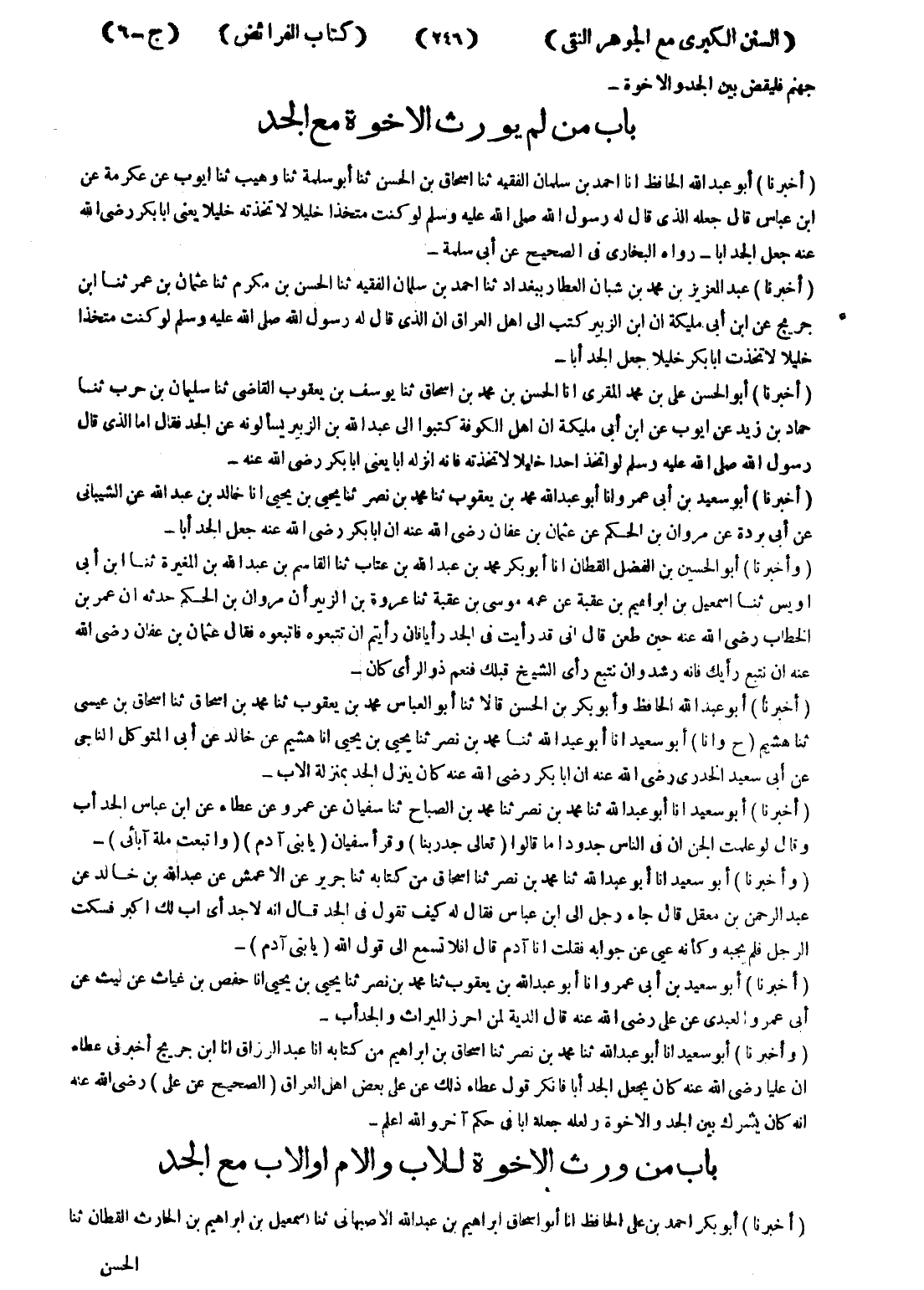 - (وأخبرنا) أبو سعيد انا أبو عبد الله ثنا محمد بن نصر ثنا اسحاق بن ابراهيم من كتابه انا عبد الرزاق انا ابن جريج أخبرني عطاء ان عليا رضى الله عنه كان يجعل الجد أبا فانكر قول عطاء ذلك عن على بعض اهل العراق (الصحيح عن على) رضى الله عنه انه كان يشرك بين الجد والاخوة و ؟ لعله جعلة ابا في حكم آخر والله اعلم