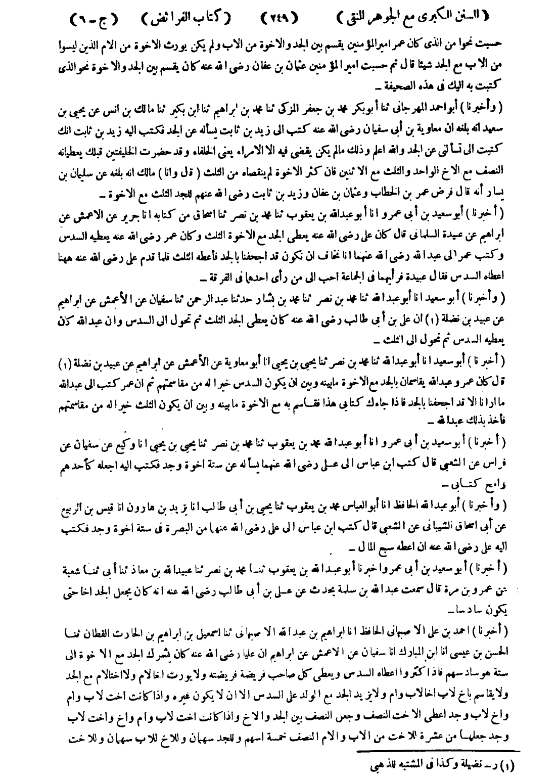 - (أخبرنا) أبو سعيد بن أبى عمرو أخبرنا أبو عبد الله بن يعقوب ثنا محمد بن نصر ثنا عبيد الله بن معاذ ثنا أبى ثنا شعبة عن عمرو بن مرة قال سمعت عبد الله بن سلمة يحدث عن على بن أبى طالب رضى الله عنه انه كان يجعل الجد اخا حتى يكون سادسا