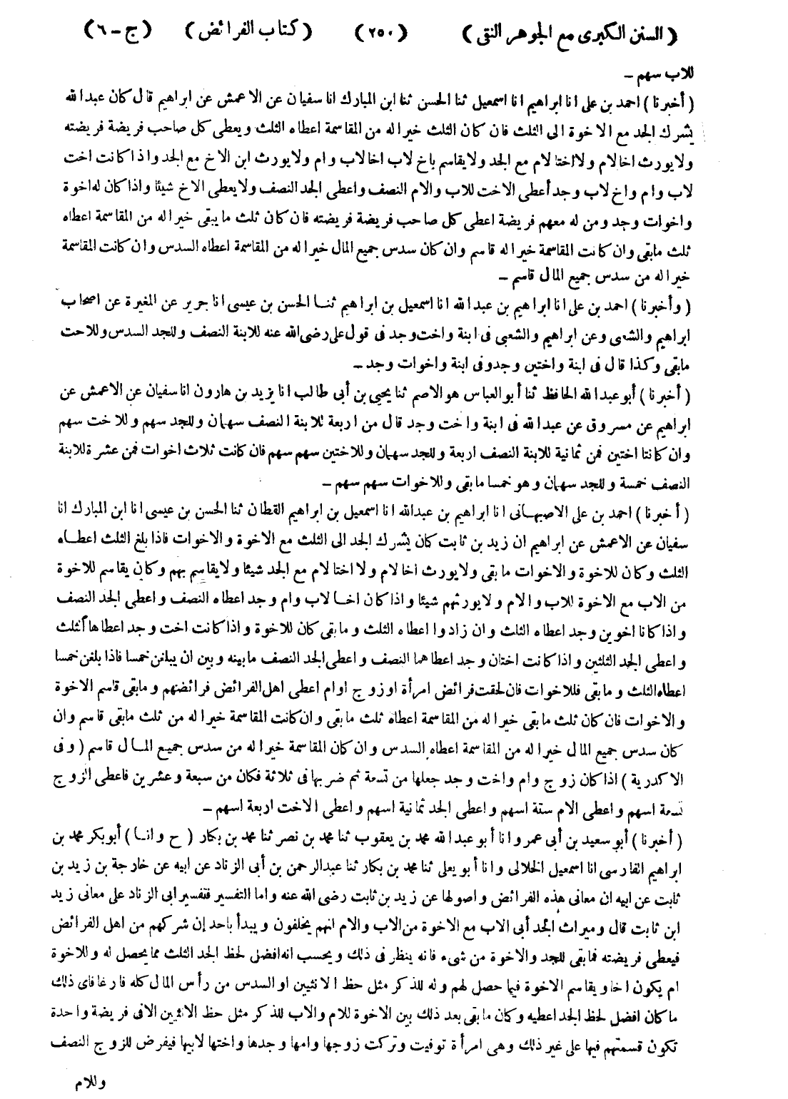 - (أخبرنا) أحمد بن على انا ابراهيم انا اسمعيل ثنا الحسن ثنا ابن المبارك انا سفيان عن الاعمش عن ابراهيم قال كان عبد الله يشرك الجد مع الاخوة إلى الثلث فان كان الثلث خيرا له من المقاسمة اعطاه الثلث ويعطى كل صاحب فريضة فريضتة ولا يورث اخا لام ولا اختا لام مع الجد ولا يقاسم باخ لاب اخا لاب وام ولا يورث ابن الاخ مع الجد وإذا كانت اخت لاب وام واخ لاب وجد أعطى الاخت للاب والام النصف واعطى الجد النصف ولا يعطى الاخ شيئا وإذا كان له اخوة واخوات وجد ومن له معهم فريضة اعطى كل صاحب فريضة فريضته فان كان ثلث ما يبقى خيرا له من المقاسمة اعطاه ثلث ما بقى وان كانت المقاسمة خيرا له قاسم وان كان سدس جميع المال خيرا له من المقاسمة اعطاه السدس وان كانت المقاسمة خيرا له من سدس جميع المال قاسم -