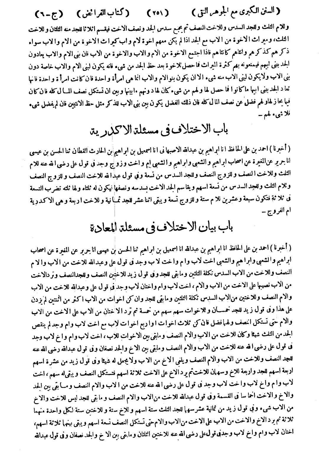 (أخبرنا) احمد بن على الحافظ انا ابراهيم بن عبد الله الاصبهاني انا اسمعيل بن ابراهيم بن الحارث القطان ثنا الحسن بن عيسى انا جرير عن المغيرة عن اصحاب ابراهيم والشعبى وابراهيم والشعبى ام واخت وزوج وجد في قول على رضى الله عنه للام الثلث وللاخت النصف وللزوج النصف وللجد السدس من تسعة وفى قول عبد الله للاخت النصف وللزوج النصف وللام الثلث وللجد السدس من تسعة اسهم ويقاسم الجد الاخت بسدسه ونصفها فيكون له ثلثاه ولها ثلثه تضرب التسعة في ثلاثة فتكون سبعة وعشرين للام ستة وللزوج تسعة ويبقى اثنا عشر للجد ثمانية وللاخت اربعة وهى الاكدرية ام الفروج