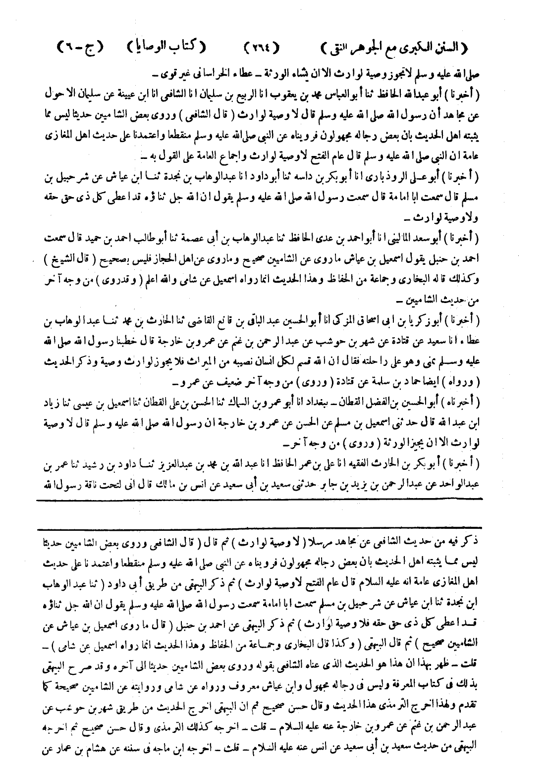 ابن نجدة ثنا ابن عياش عن شرحبيل بن مسلم سمعت أبا امامة سمعت رسول الله صلى الله عليه وسلم يقول ان الله جل ثناؤه قد اعطى كل ذى حق حقه فلا وصية لوارث) ثم ذكر البيهقى عن احمد بن حنبل (قال ما روى اسمعيل بن عياش عن الشاميين صحيح) ثم قال البيهقى (وكذا قال البخاري وجماعة من الحفاظ وهذا الحديث انما رواه اسمعيل عن شامى) - قلت - ظهر بهذا ان هذا هو الحديث الذى عناه الشافعي بقوله وروى بعض الشاميين حديثا إلى آخره وقد صرح البيهقى بذلك في كتاب المعرفة وليس في رجاله مجهول وابن عياش معروف ورواه عن شامى وروايته عن الشاميين صحيحة كما تقدم ولهذا اخرج الترمذي هذا الحديث وقال حسن صحيح ثم ان البيهقى اخرج الحديث من طريق شهر بن حوشب عن عبد الرحمن بن غنم عن عمرو بن خارجة عنه عليه السلام - قلت - اخرجه كذلك الترمذي وقال حسن صحيح ثم اخرجه البيهقى من حديث سعيد بن أبى سعيد عن انس عنه عليه السلام - قلت - اخرجه ابن ماجه في سننه عن هشام بن عمار عن