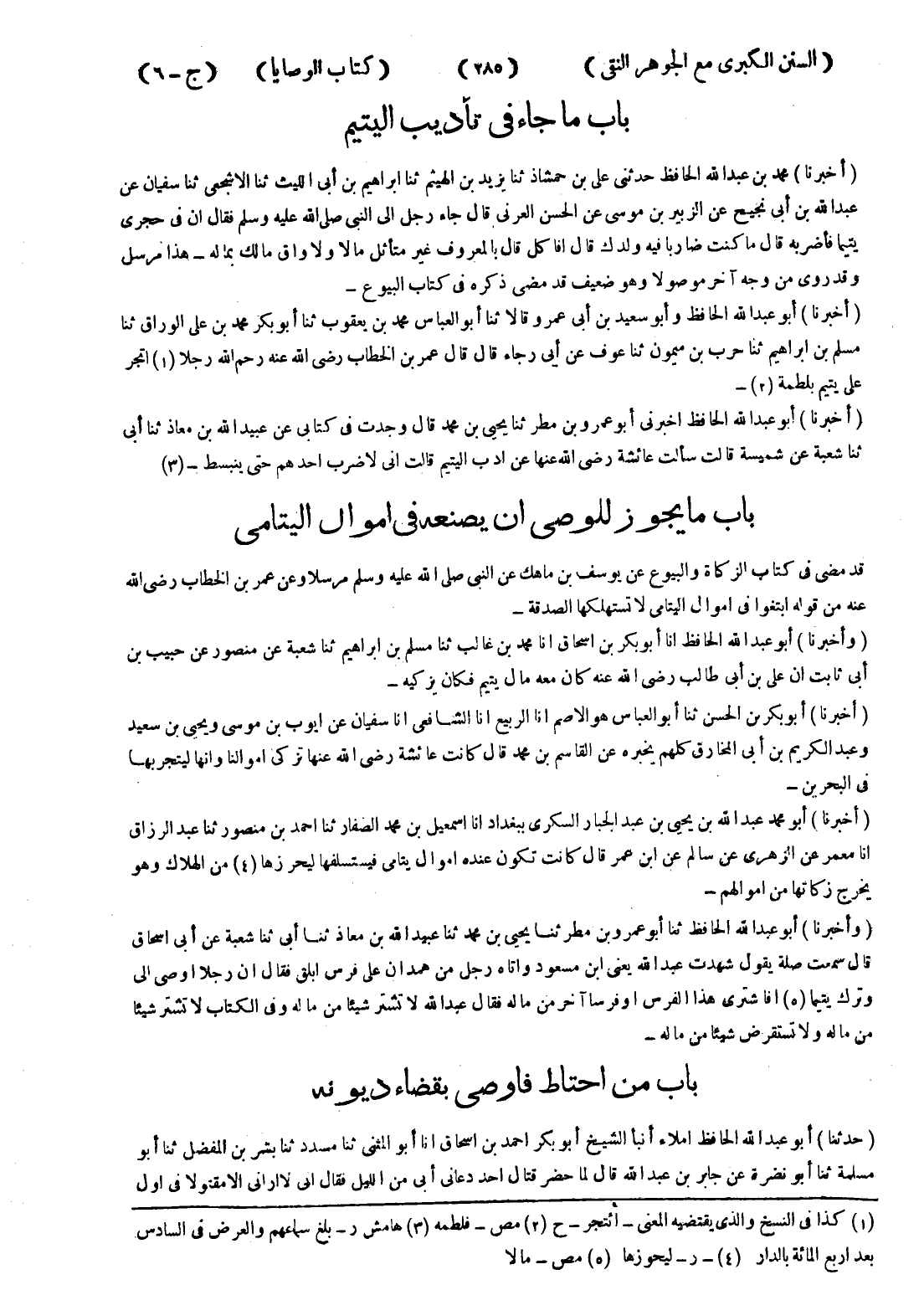 - (أخبرنا) أبو محمد عبد الله بن يحيى بن عبد الجبار السكرى ببغداد انا اسمعيل بن محمد الصفار ثنا احمد بن منصور ثنا عبد الرزاق انا معمر عن الزهري عن سالم عن ابن عمر قال كانت تكون عنده اموال يتامى فيستلفها ليحرزها (4) من الهلاك وهو يخرج زكاتها من اموالهم - (وأحبرنا) أبو عبد الله الحافظ ثنا أبو عمرو بن مطر ثنا يحيى بن محمد ثنا عبيد الله بن معاذ ثنا أبى ثنا شعبة عن أبى اسحاق قال سمعت صلة يقول شهدت عبد الله يعنى ابن مسعود واتاه رجل من همدان على فرس ابلق فقال ان رجلا اوصى إلى وترك يتيما (5) فاشترى هذا الفرس أو فرسا آخرين من ماله فقال عبد الله لا تشتر شيئا من ماله وفى الكتاب لا تشتر شيئا من ماله ولا تستقرض شيئا من ماله