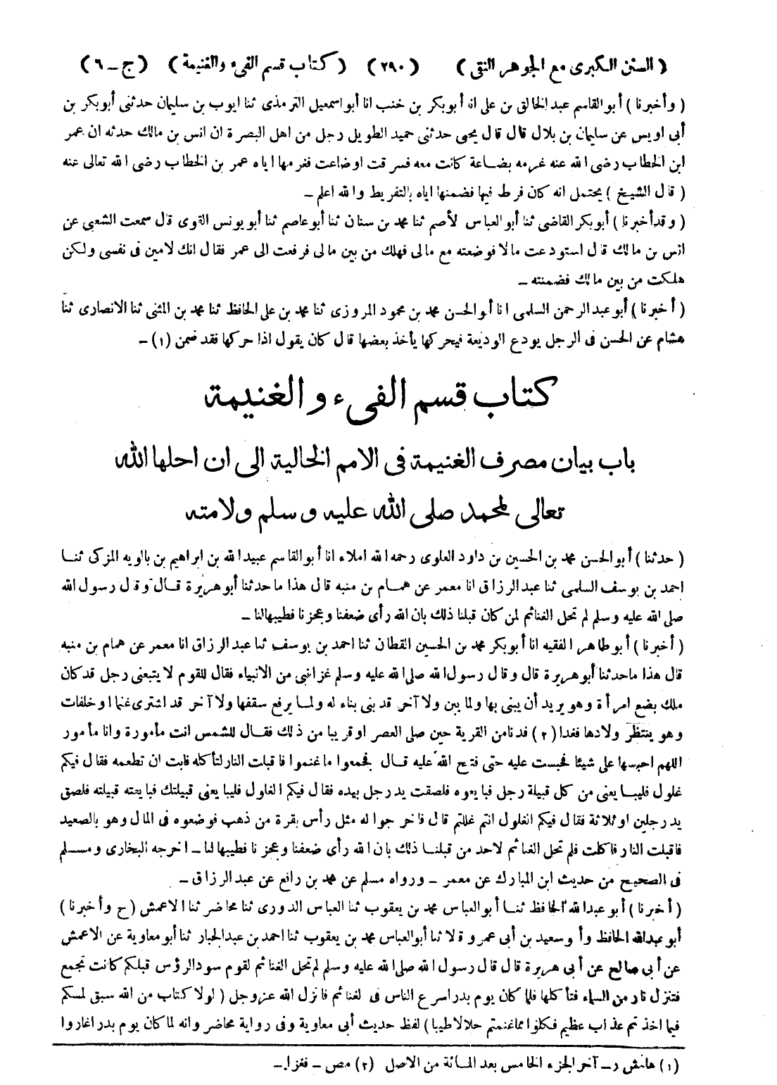 - (أخبرنا) أبو طاهر الفقيه انا أبو بكر محمد بن الحسين القطان ثنا احمد بن يوسف ثنا عبد الرزاق انا معمر عن همام بن منبه قال هذا ما حدثنا أبو هريرة قال وقال رسول الله صلى الله عليه وسلم غزا بنى من الانبياء فقال للقوم لا يتبعني رجل قد كان ملك بضع امرأة وهو يريد أن يبنى بها ولما بين ولا آخر قد بنى بناء له ولما يرفع سقفها ولا آخر قد اشترى غنما أو خلفات وهو ينتظر ولادها فغدا (2) فدنا من القرية حين صلى العصر أو قريبا من ذلك فقال للشمس انت مأمورة وانا مأمور اللهم احبسها على شيئا فحبست عليه قال فجمعواما غنموا فاقبلت النار لتأكله فابت ان تعطعمه فقال فيكم علول فليبايعني من كل قبيلة رجل فبايعوه فلصقت يد رجل بيده فقال فيكم الغلول فليبايعني قبيلتك فبايعته قبيلته فلصق يد رجلين أو ثلاثة قال فيكم الغلول انتم غللتم قال فاخرجوا له مثل رأس بقرة من ذهب فوضعوه في المال وهو بالصعيد فاقبلت النار فاكلت فلم تحل الغنائم لاحد من قبلنا ذلك بان الله راى ضعفنا وعجزنا فطيبها لنا - اخرجه البخاري ومسلم في الصحيح من حديث ابن المبارك عن معمر - ورواه مسلم عن محمد بن رافع عن عبد الرزاق