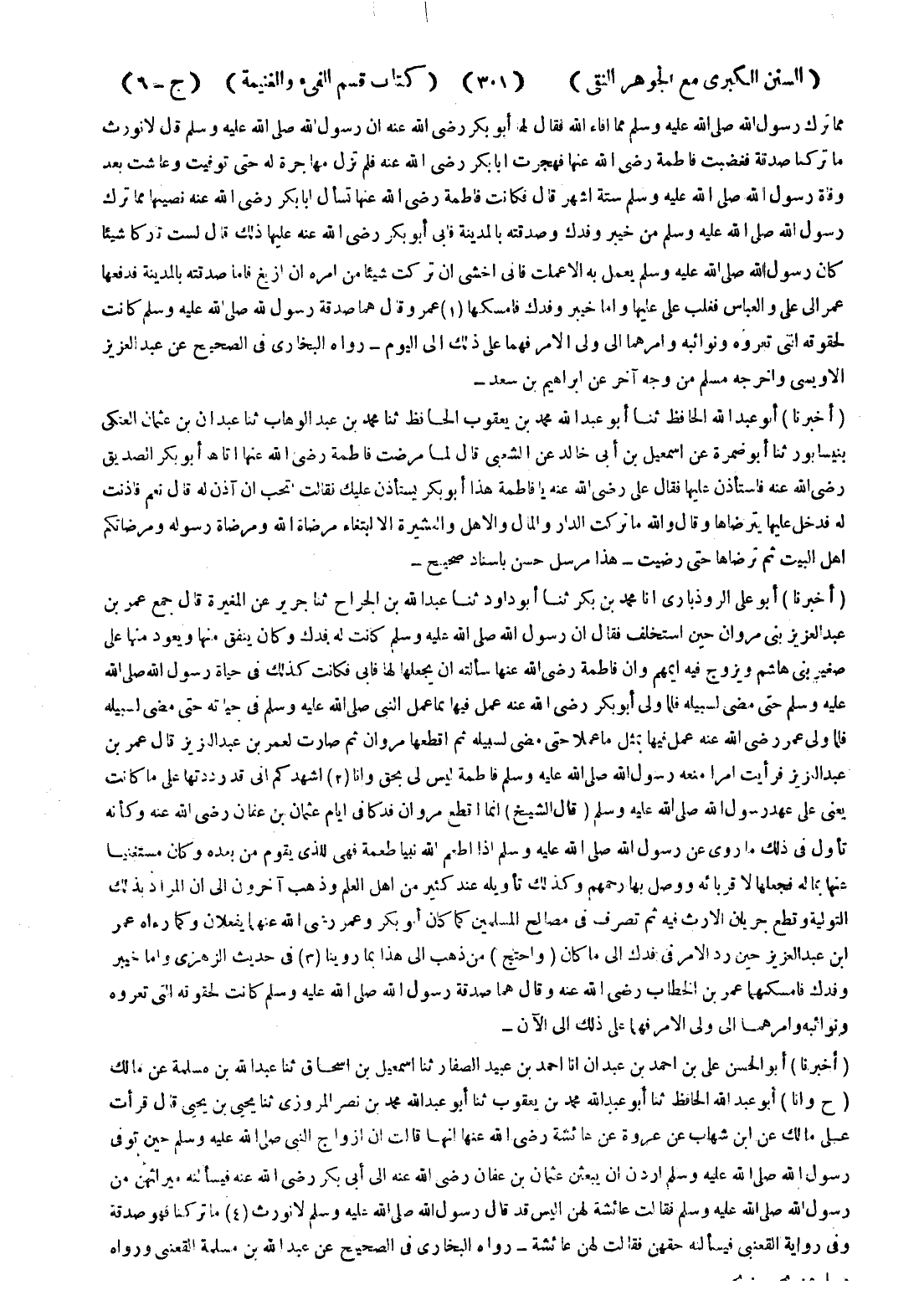 - (أخبرنا) أبو الحسن على بن احمد بن عبدان انا احمد بن عبيد الصفار ثنا اسمعيل بن اسحاق ثنا عبد الله بن مسلمة عن مالك (ح وانا) أبو عبد الله الحافظ ثنا أبو عبد الله محمد بن يعقوب ثنا أبو عبد الله محمد بن نصر المروزى ثنا يحيى بن يحيى قال قرأت على مالك عن ابن شهاب عن عروة عن عائشة رضى الله عنها انها قالت ان ازواج النبي صلى الله عليه وسلم حين توفى رسول الله صلى الله عليه وسلم اردن ان يبعثن عثمان بن عفان رضى الله عنه إلى أبى بكر رضى الله عنه فيسألنه ميراثهن من رسول الله صلى الله عليه وسلم فقالت عائشة لهن اليس قد قال رسول الله صلى الله عليه وسلم لا نورث (4) ما تركنا فهو صدقة وفى رواية القعنبى فيسألنه حقهن فقالت لهن عائشة - رواه البخاري في الصحيح عن عبد الله بن مسلمة القعنبى ورواه مسلم عن يحيى بن يحيى