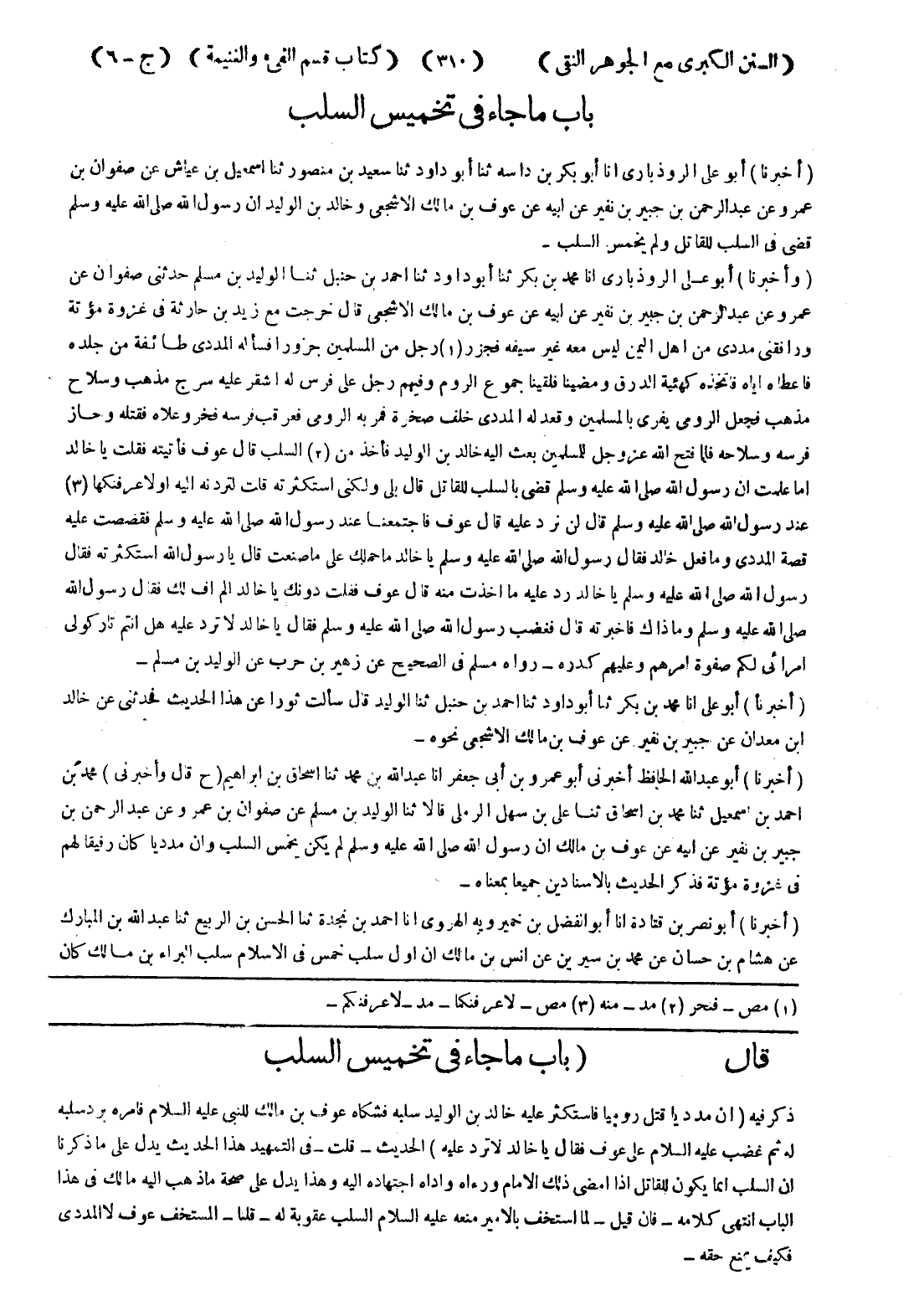 قال (باب ما جاء في تخميس السلب ذكر فيه (ان مدد يا قتل روميا فاستكثر عليه خالد بن الوليد سلبه فشكاه عوف بن مالك للنبى عليه السلام فأمره برد سلبه له ثم غضب عليه السلام على عوف فقال يا خالد لا ترد عليه) الحديث - قلت - في التمهيد هذا الحديث يدل على ما ذكرنا ان السلب انما يكون للقاتل إذا امضى ذلك الامام ورءاه واداه اجتهاده إليه وهذا يدل على صحة ما ذهب إليه مالك في هذا الباب انتهى كلامه - فان قيل - لما استخف بالامير منعه عليه السلام السلب عقوبة له - قلنا - المستخف عوف لا المددى فكيف يمنع حقه -
