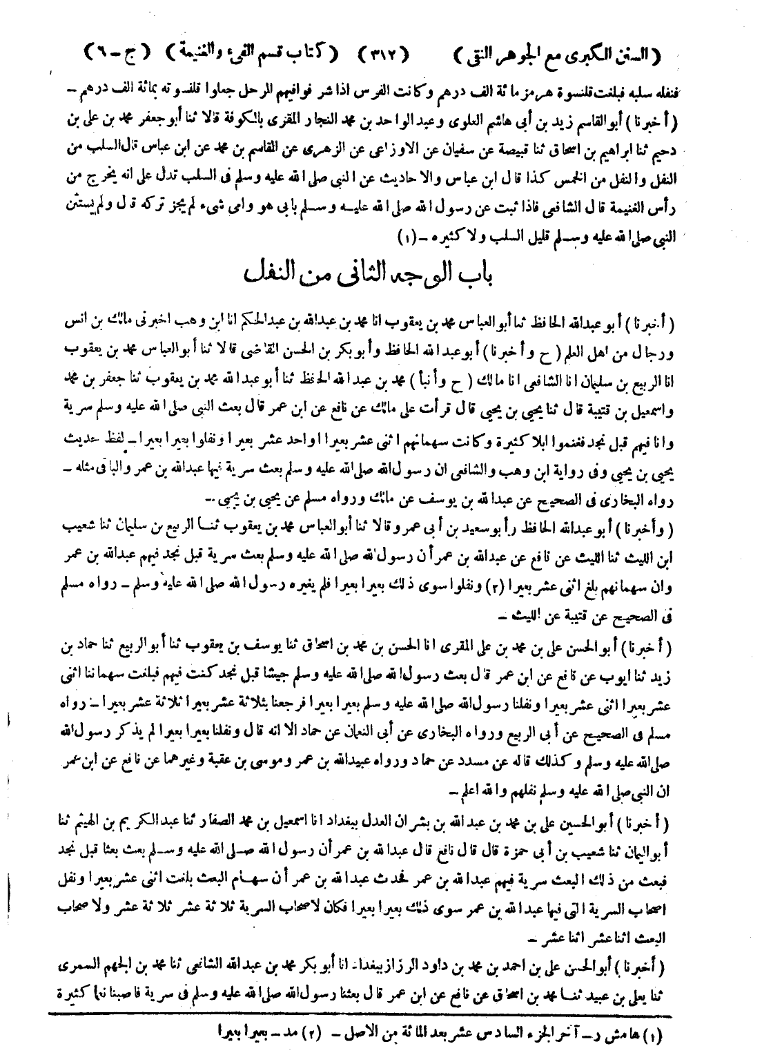 - (أخبرنا) أبو الحسين على بن محمد بن عبد الله بن بشران العدل ببغداد انا اسمعيل بن محمد الصفار ثنا عبد الكريم بن الهيثم ثنا أبو اليمان ثنا شعيب بن أبى حمزة قال قال نافع قال عبد الله بن عرم أن رسول الله صلى الله عليه وسلم بعث بعثا قبل نجد فبعث من ذلك البعث سرية فيهم عبد الله بن عمر فحدث عبد الله بن عمر أن سهام البعث بلغت اثنى عشر بعيرا ونفل اصحاب السرية التى فيها عبد الله بن عمر سوى ذلك بعيرا بعيرا فكان لاصحاب السرية ثلاثة عشر ثلاثة عشر ولا صحاب البعث اثنا عشر اثنا عشر