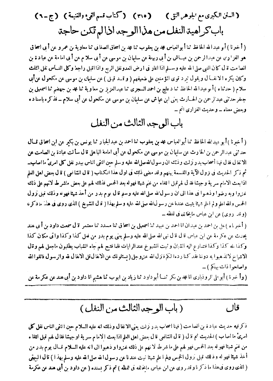 قال (باب الوجه الثالث من النفل) ذكر فيه حديث عبادة بن الصامت (فينا اصحاب بدر نزلت يعنى الانفال وذلك انه عليه السلام حين التقى الناس نفل كل امرئ ما اصاب) الحديث ثم قال (قال الشافعي قال بعض اهل العلم إذا بعث الامام سرية أو جيشا فقال لهم قبل اللقاء من غنم شيئا فهو له بعد الخمس فهو لهم على ما شرط لانهم على ذلك غزوا وذهبوا إلى انه عليه السلام قال يوم بدر من أخذ شيئا فهو له وذلك قبل نزول الخميس ولم اعلم شيئا ثبت عندنا عن رسول الله صلى الله عليه وسلم بهذا) قال البيهقى (الذى روى في هذا ما ذكرنا وقد روى عن ابن عباس ما يخلفه في لفظه) ثم ذكر بسنده (عن داود بن أبى هند عن عكرمة
