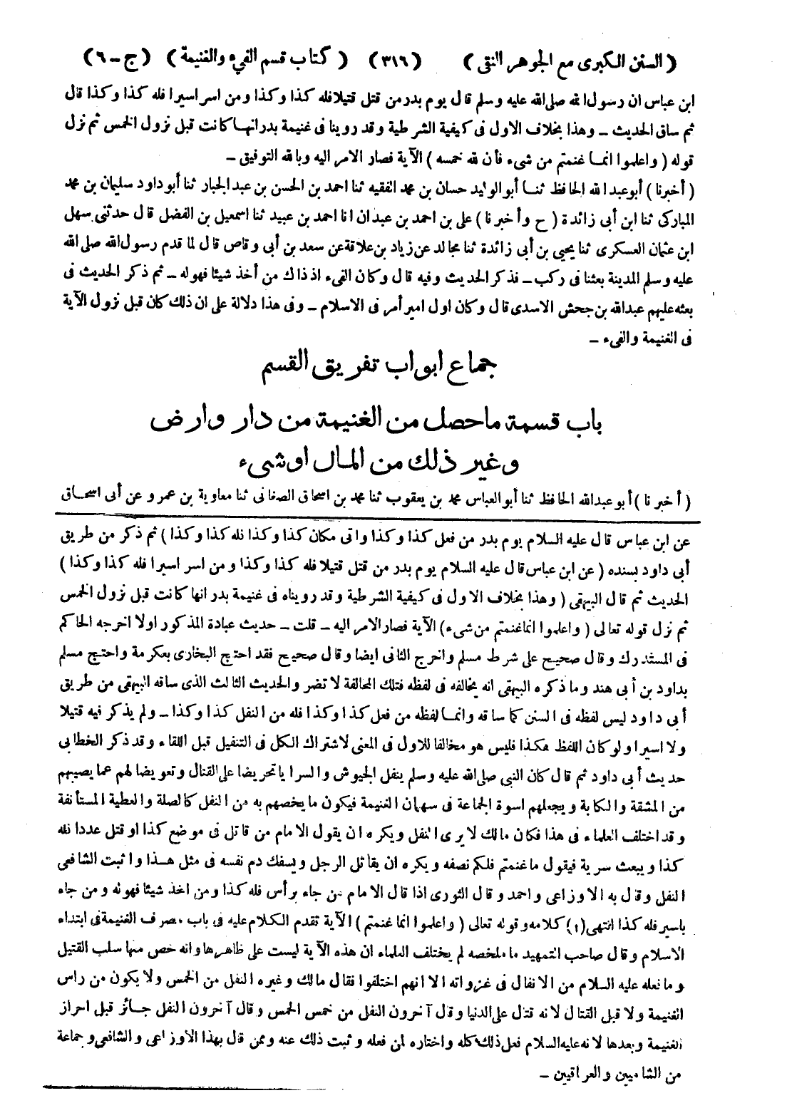 عن ابن عباس قال عليه السلام يوم بدر من فعل كذا وكذا واتى مكان كذا وكذا فله كذا وكذا) ثم ذكر من طريق أبي داود بسنده (عن ابن عباس قال عليه السلام يوم بدر من قتل قتيلا فله كذا وكذا ومن اسر اسيرا فله كذا وكذا) الحديث ثم قال البيهقي (وهذا بخلاف الاول في كيفية الشرطية وقد رويناه في غنيمة بدر انها كانت قبل نزول الخمس ثم نزل قوله تعالى (واعلموا انما غنمتم من شئ) الآية فصار الامر إليه - قلت - حديث عبادة المذكور اولا اخرجه الحاكم في المستدرك وقال صحيح على شرط مسلم واخرج الثاني ايضا وقال صحيح فقد احتج البخاري بعكرمة واحتج مسلم بداود بن أبي هند وما ذكره البيهقي انه يخالفه في لفظه فتلك المحالفة لا تضر والحديث الثالث الذي ساقه البيهقي من طريق أبي داود ليس لفظه في السنن كما ساقه وانما لفظه من فعل كذا وكذا فله من النفل كذا وكذا - ولم يذكر فيه قتيلا