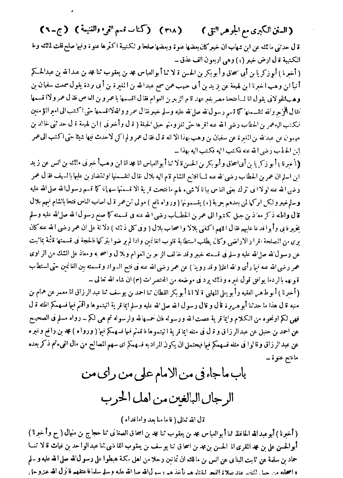 - (أخبرنا) أبو زكريا بن أبى اسحاق وأبو بكر بن الحسن قالا ثنا أبو العباس انا محمد انا ابن وهب أخبرني مالك بن انس عن زيد ابن اسلم ان عمربن الخطاب رضى الله عنه لما افتتح الشام قام إليه بلال فقال لتقسمنها أو لنتضاربن عليها بالسيف فقال عمر رضى الله عنه لولا انى اترك يعنى الناس ببانا لا شئ لهم ما فتحت قرية الاقسمتها سهمانا كما قسم رسول الله صلى الله عليه وسلم خيبر ولكن اتركها لمن بعدهم جرية (2) يقسمونا (ورواه نافع) مولى ابن عمر قال اصاب الناس فتحا بالشام فيهم بلال قال واظنه ذكر معاذ بن جبل فكتبوا إلى عمربن الخطاب رضى الله عنه في قسمته كما صنع رسول الله صلى الله عليه وسلم بخيبر فابى وأبوا فدعا عليهم فقال اللهم اكفني بلالا واصحاب بلال (وفى كل ذلك) دلالة على ان عمر رضى الله عنه كان يرى من المصلحة قرار الاراضي وكان يطلب استطابة قلوب الغانمين واذ لم يرضوا بتركها فالحجة في قسمتها قائمة بما ثبت عن رسول الله صلى الله عليه وسلم في قسمته خيبر وقد خالف الزبير بن العوام وبلال واصحابه ومعاذ على الشك من الراوى عمر رضى الله عنه فيما راى والله اعلم (وقد روينا) عن عمر رضى الله عنه في فتح السواد وقسمته بين الغانمين حتى استطاب