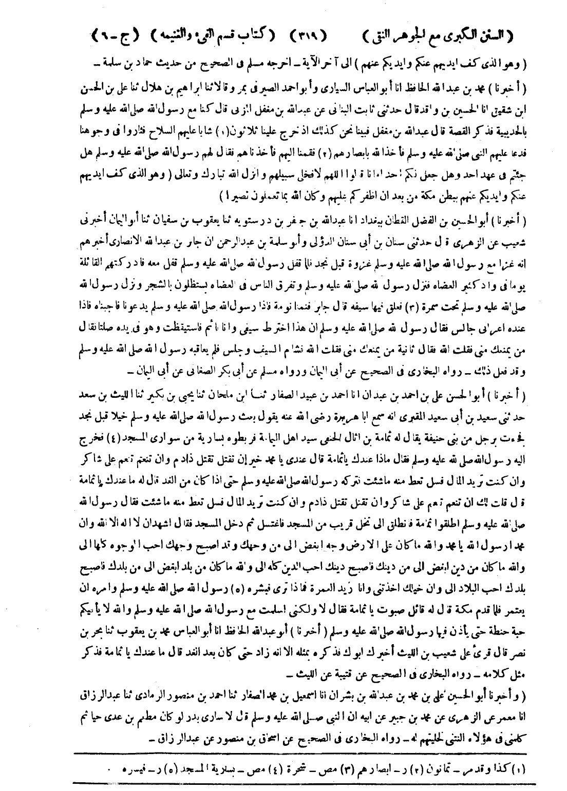 - (أخبرنا) أبو الحسن على بن احمد بن عبدان انا احمد بن عبيد الصفار ثنا ابن ملحان ثنا يحيى بن بكير ثنا الليث بن سعد حدثنى سعيد بن أبى سعيد المقبرى انه سمع ابا هريرة رضى الله عنه يقول بعث رسول الله صلى الله عليه وسلم خيلا قبل نجد فجاءت برجل من بنى حينفة يقال له ثمامة بن اثال الحنفي سيد اهل اليمامة فربطوه بسارية من سوارى المسجد (4) فخرج إليه رسول الله صلى الله عليه وسلم فقال ماذا عندك يا ثمامة قال عندي يا محمد خير إن تقتل تقتل ذا دم وان تنعم تنعم على شاكر وان كنت تريد المال فسل تعط منه ما شئت فتركه رسول الله صلى الله عليه وسلم حتى إذا كان من الغد قال له ما عندك يا ثمامة قال قلت لك ان تنعم تنعم على شاكر وان تقتل تقتل ذا دم وان كنت تريد المال فسل تعط منه ما شئت فقال رسول الله صلى الله عليه وسلم اطلقوا ثمامة فانطلق إلى نخل قريب من المسجد فاغتسل ثم دخل المسجد فقال اشهد ان لا اله الا الله وان محمدا رسول الله يا محمد والله ما كان على الارض وجه ابغض إلى من وجهك وقد اصبح وجهك احب الوجوه كلها إلى والله ماكان من دين ابغض إلى من دينك فاصبح دينك احب الدين كله إلى والله ما كان من بلد ابغض إلى من بلدك فاصبح بلدك احب البلاد إلى وان خيلك اخذتني وانا زيد العمرة فماذا ترى فبشره (5) رسول الله صلى الله عليه وسلم وامره ان يعتمر فلما قدم مكة قال له قائل صبوت يا ثمامة فقال لا ولكني اسلمت مع رسول الله صلى الله عليه وسلم والله لا يأتيكم حبة حنطة حتى يأذن فيها رسول الله صلى الله عليه وسلم