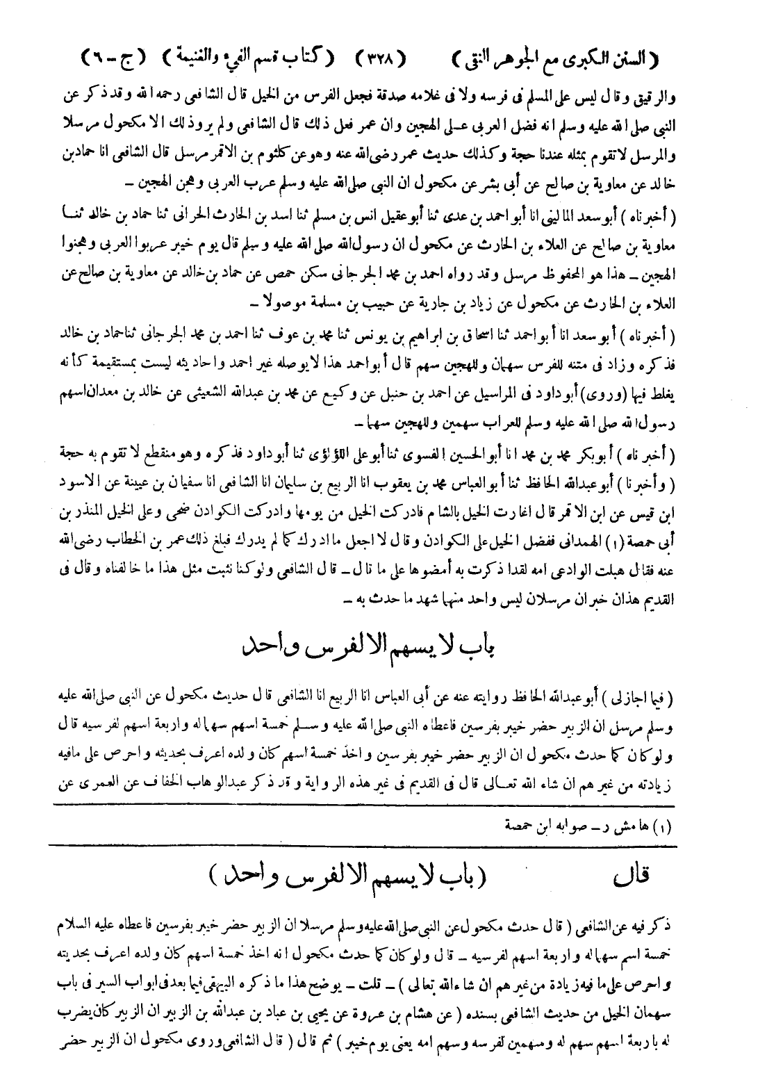 قال (باب لا يسهم الا لفرس واحد) ذكر فيه عن الشافعي (قال حدث مكحول عن النبي صلى الله عليه وسلم مرسلا الزبير حضر خيبر بفرسين فاعطاه عليه السلام خمسة اسم سهما له واربعة اسهم لفرسيه - قال ولو كان كما حدث مكحول انه اخذ خمسة اسهم كان ولده اعرف بحديته واحرص على ما فيه زيادة من غيرهم ان شاء الله تعالى) - قلت - يوضح هذا ما ذكره البيهقى فيما بعد في ابواب السير في باب سهمان الخيل من حديث الشافعي بسنده (عن هشام بن عروة عن يحيى بن عباد بن عبد الله بن الزبير ان الزبير كان يضرب له باربعة اسهم سهم له وسهمين لفرسه وسهم امه يعنى يوم خيبر) ثم قال (قال الشافعي وروى مكحول ان الزبير حضر