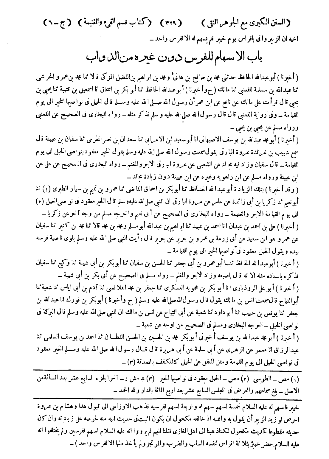 خيبر فاسهم له عليه السلام خمسة اسهم سهم له واربعة اسهم لفرسية فذهب الاوزاعي إلى قبول هذا وهشام بن عروة احرص لو زيد الزبير أن يقول به واشبه إذ خالفه مكحول ان يكون اثبت في حديث ابيه منه لحرصه على زيادته وان كان حديثه مقطوعا كحديث مكحول لكنا ذهبنا إلى اهل المغازى فقلنا انهم لم يرووا انه عليه السلام اسهم لفرسين ولم يختلفوا انه عليه السلام حضر خيبر بثلاثة افراس لنفسه السلب والضرب والمرتجز ولم يأخذ منها الا لفرس واحد) -