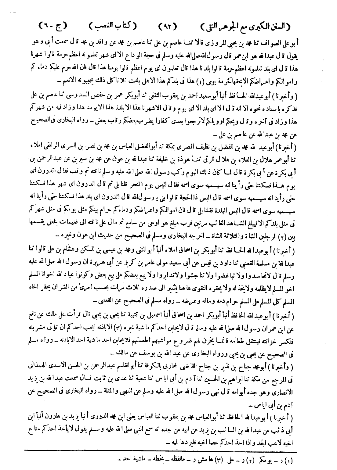 - (وأخبرنا) أبو عبد الله الحافظ أنبأ أبو سعيد احمد بن يعقوب الثقفى ثنا أبو بكر عمربن حفص السدوسى ثنا عاصم بن على فذكره باسناده نحوه الا انه قال الا أي بلد الا أي يوم وقال الا شهرنا هذا الا بلدنا هذا لا يومنا هذا وزاد فيه من شهركم هذا وزاد في آخره وقال ويحكم أو ويلكم لا ترجعوا بعدى كفارا يضرب بعضكم رقاب بعض - رواه البخاري في الصحيح عن محمد بن عبد الله عن عاصم بن على