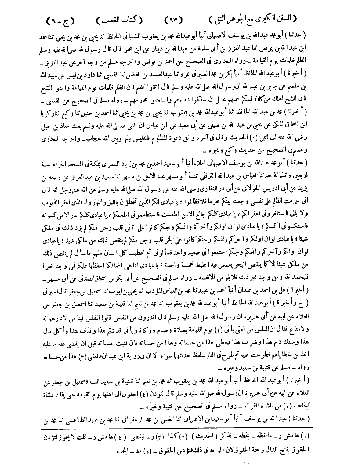 - (أخبرنا) أبو عبد الله الحافظ أنبأ أبو عبد الله محمد بن يعقوب ثنا محمد بن نعيم ثنا قتيبة بن سعيد ثنا اسمعيل بن جعفر عن العلاء عن ابيه عن أبى هريرة ان رسول لله صلى الله عليه وسلم قال لتودن (4) الحقوق إلى اهلها يوم القيامة حتى يقاد للشاة الجلحاء (5) من الشاة القرناء - رواه مسلم في الصحيح عن قتيبة وغيره -