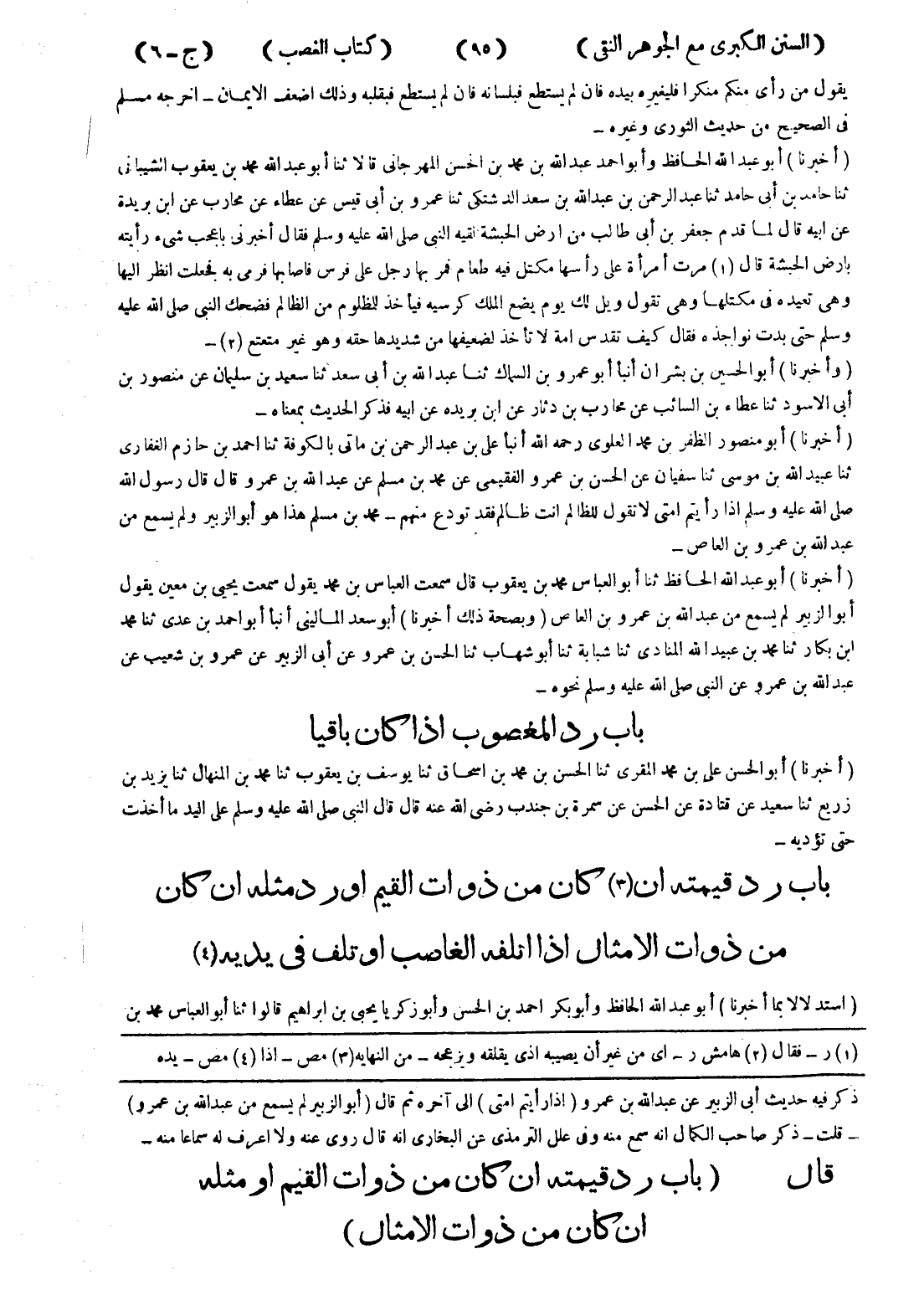 ذكر فيه حديث أبى الزبير عن عبد الله بن عمرو (إذا رأيتم امتى) إلى آخره ثم قال (أبو الزبير لم يسمع من عبد الله بن عمرو) - قلت - ذكر صاحب الكمال انه سمع منه وفى علل الترمذي عن البخاري انه قال روى عنه ولا اعرف له سماعا منه - قال (باب رد قيمته ان كان من ذوات القيم أو مثله ان كان من ذوات الامثال)