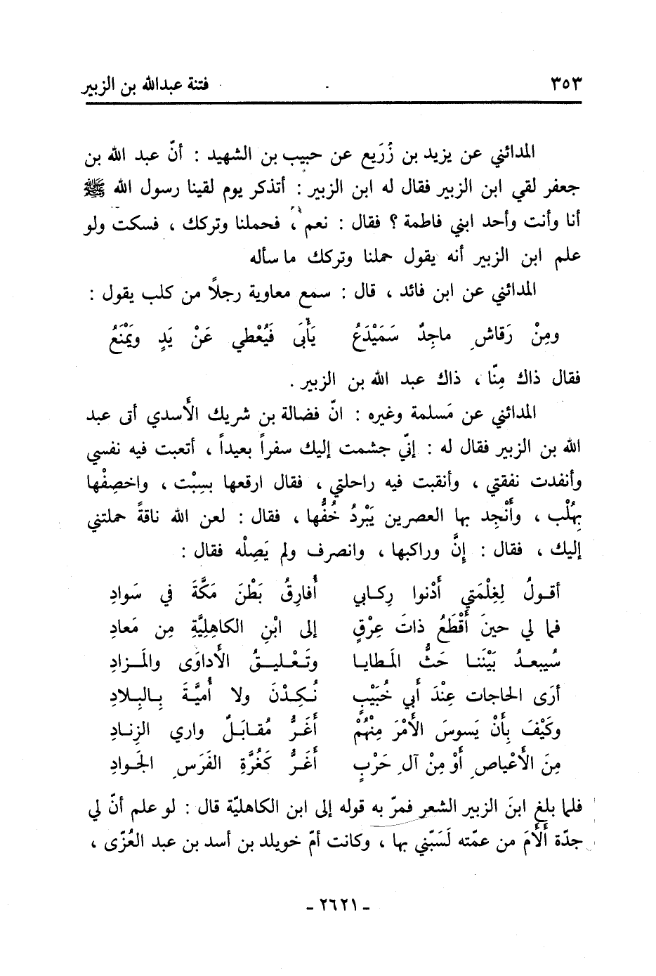 الْمَدَائِنِي عَنْ يَزِيد بْن زريع عَنْ حبيب بْن الشهيد: أَن عَبْد اللَّهِ بْن جَعْفَر لقي ابْن الزُّبَيْر فَقَالَ لَهُ ابْن الزُّبَيْر: أَتَذْكُرُ يَوْمَ لَقِينَا رَسُولَ اللَّهِ صَلَّى اللَّهُ عَلَيْهِ وَسَلَّمَ إِنَّا وأنت وأحد ابني فاطمة؟ فقال: نعم، فحملنا وتركك، فسكت ولو علم ابْن الزُّبَيْر أَنَّهُ يَقُول حملنا وتركك مَا سَأَلَهُ.