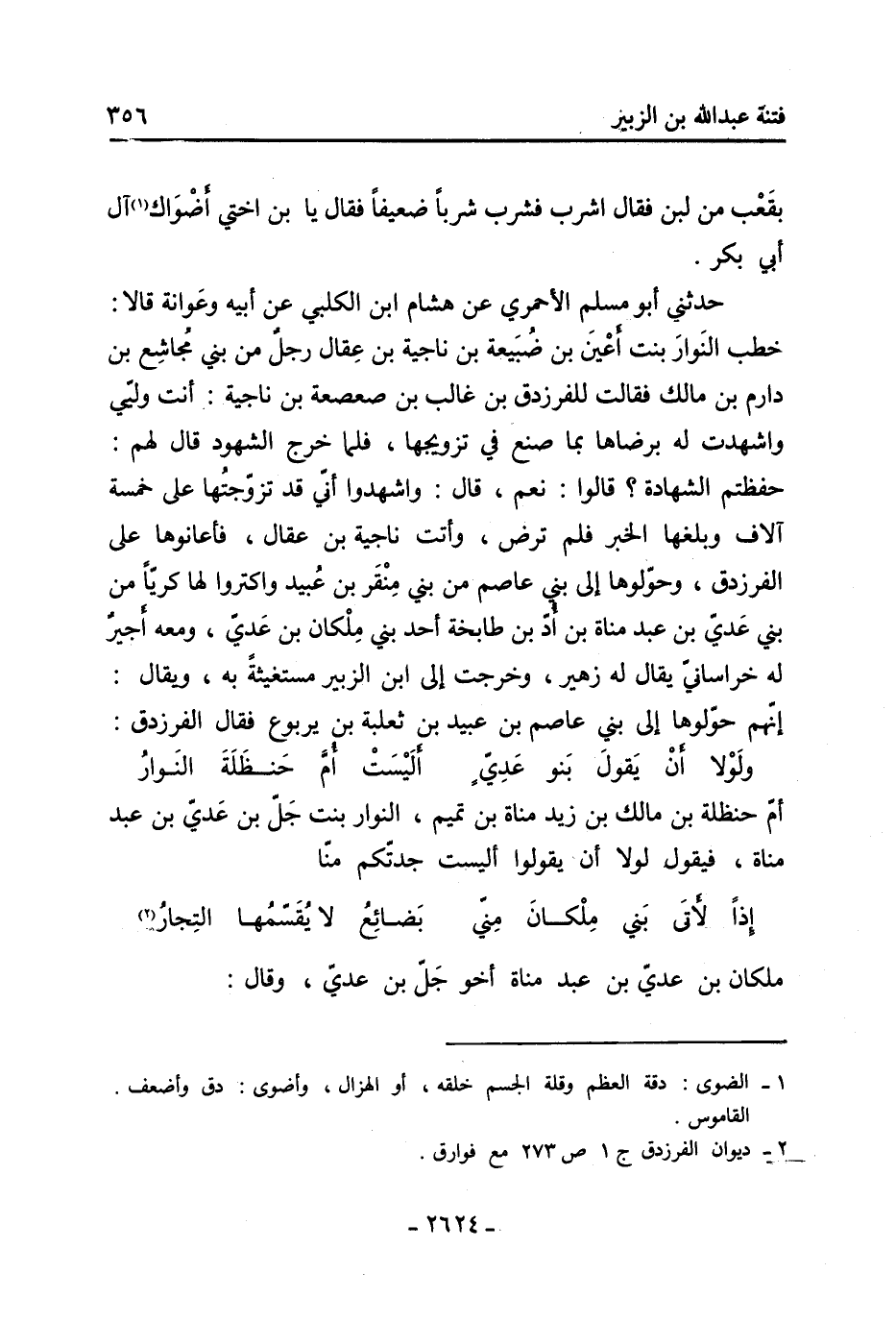 حفظتم الشهادة؟ قَالُوا: نعم، قَالَ: واشهدوا أني قَدْ تزوجتها عَلَى خمسة آلاف وبلغها الْخَبَر فلم ترض، وأتت ناجية بْن عقال، فأعانوها عَلَى الفرزدق، وحولوها إِلَى بَنِي عَاصِم من بَنِي منقر بْن عبيد واكتروا لَهَا كريا من بَنِي عدي بْن عَبْد مناة بْن أد بْن طابخة أحد بَنِي ملكان بْن عدي، ومعه أجير لَهُ خراساني يقال لَهُ زهير، وخرجت إِلَى ابْن الزُّبَيْر مستغيثة بِهِ، ويقال: