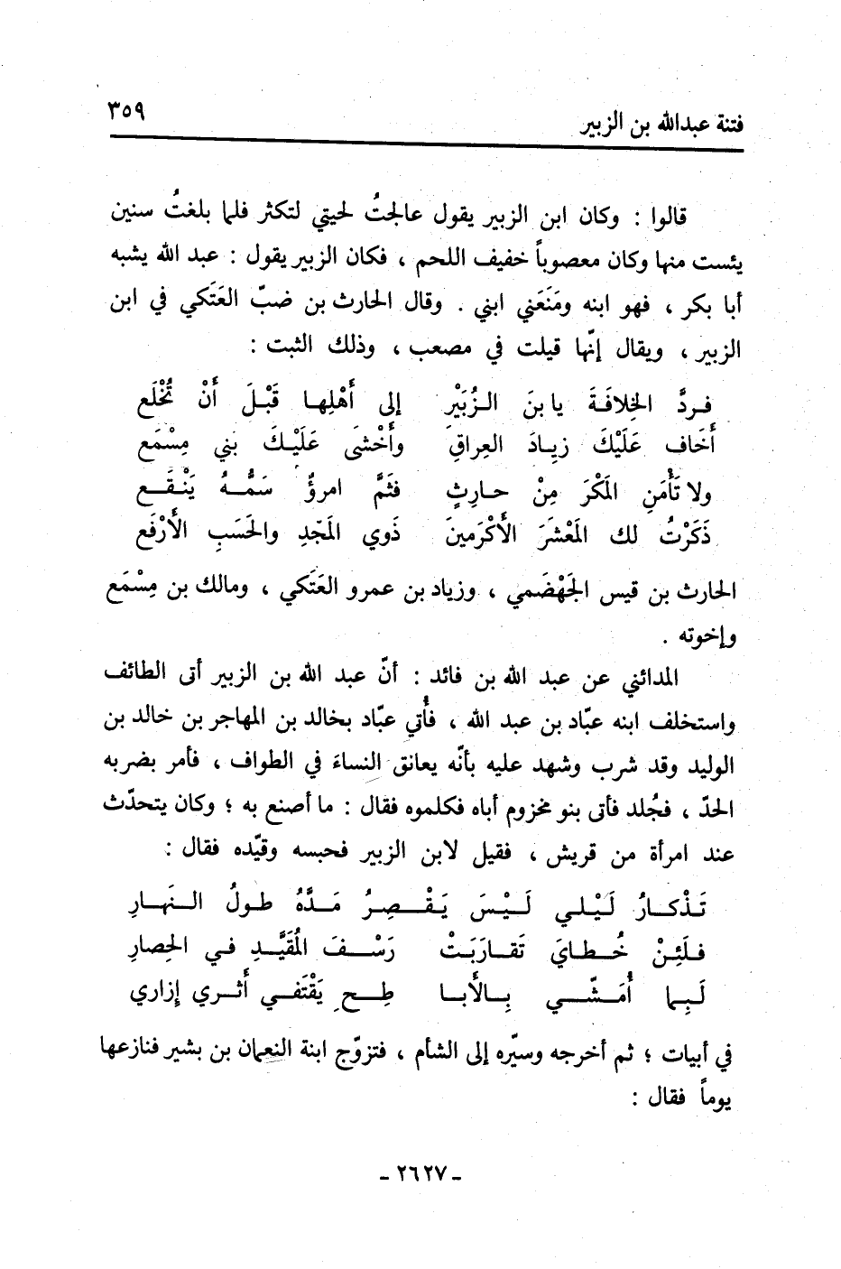 قَالُوا: وَكَانَ ابْن الزُّبَيْر يَقُول عالجت لحيتي لتكثر فلما بلغت سنين يئست منها وَكَانَ معصوبا خفيف اللحم، فكان الزُّبَيْر يَقُول: عَبْد اللَّهِ يشبه أبا بَكْر، فَهُوَ ابنه ومنعني ابني. وَقَالَ الْحَارِث بْن ضب العتكي فِي ابْن الزُّبَيْر، ويقال إنها قيلت فِي مُصْعَب، وَذَلِكَ الثبت: