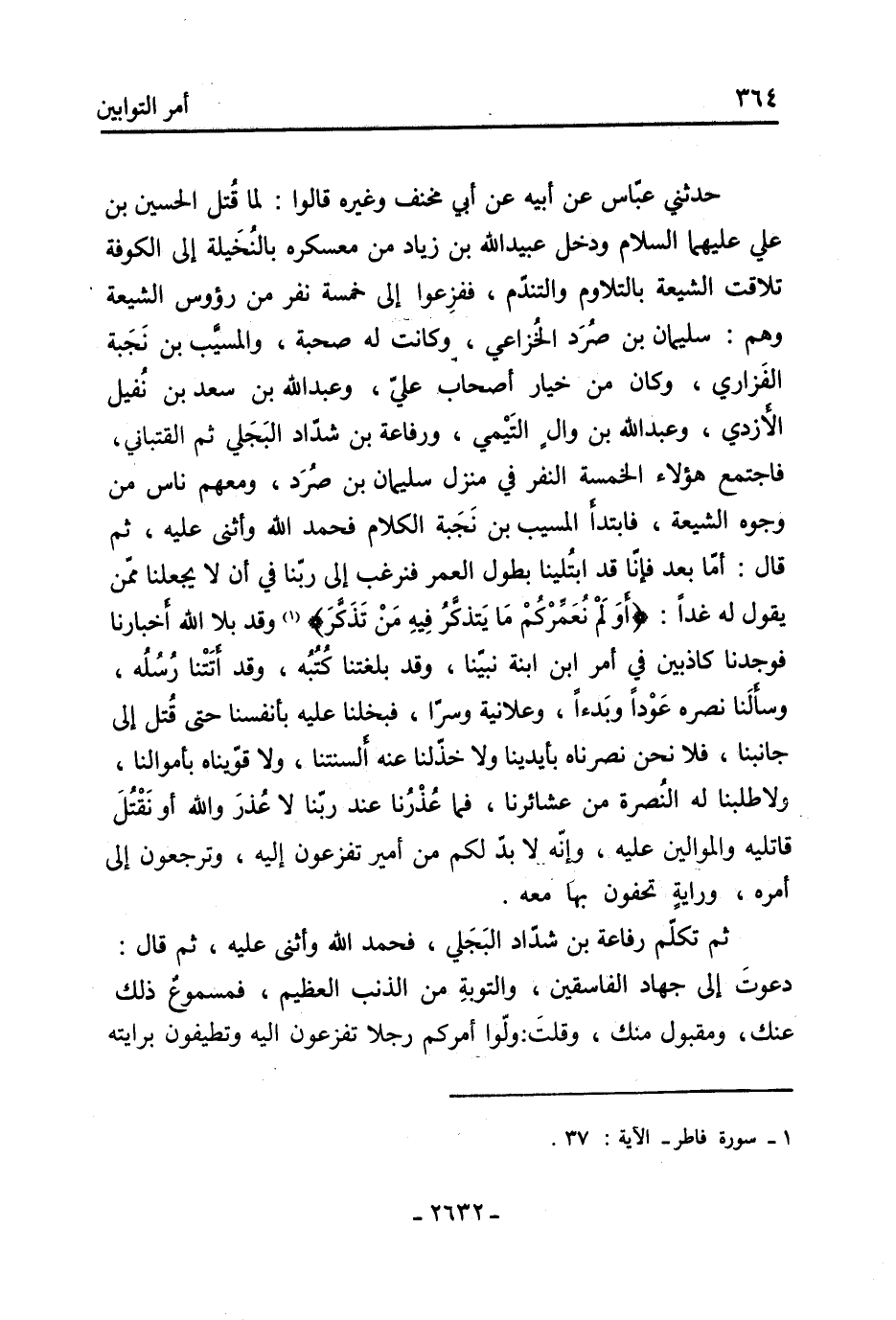 حَدَّثَنِي عَبَّاس عَنْ أَبِيهِ عَنْ أَبِي مخنف وغيره قَالُوا: لما قتل الْحُسَيْن بْن عَلِي عليهما السَّلام ودخل عُبَيْد اللَّهِ بْن زِيَاد من معسكره بالنخيلة إِلَى الكوفة تلاقت الشيعة بالتلاوم والتندّم، ففزعوا إلى خمسة نفر من رؤوس الشيعة وَهُمْ: سُلَيْمَان بْن صرد الخزاعي، وكانت لَهُ صحبة، والمسيب بْن نجبة الفزاري، وَكَانَ من خيار أَصْحَاب عَلِي، وعبد اللَّه بْن سَعْد بْن نفيل الأزدي، وعبد اللَّه بْن وال التَّيْمِي، ورفاعة بْن شداد البجلي ثُمَّ القتباني، فاجتمع هَؤُلاءِ الخمسة النفر فِي منزل سُلَيْمَان بْن صرد، ومعهم ناس من وجوه الشيعة، فابتدأ الْمُسَيِّب بْن نجبة الْكَلام فحمد الله وأثنى عليه، ثم قال: أما بعد فإنا قَدِ ابتلينا بطول العمر فنرغب إِلَى ربنا فِي أَن لا يجعلنا مِمَّن يَقُول لَهُ غدا: أَوَلَمْ نُعَمِّرْكُمْ مَا يَتذكَّرُ فِيهِ مَنْ تَذَكَّرَ [1] وَقَدْ بلا اللَّه أخبارنا فوجدنا كاذبين فِي أمر ابْن ابنة نبينا، وَقَدْ بلغتنا كتبه، وَقَدْ أتتنا رسله، وسألنا نصره عودا وبدءًا، وعلانية وسرًا، فبخلنا عَلَيْهِ بأنفسنا حَتَّى قتل إلى جانبنا، فلا نحن نصرناه بأيدينا ولا خذلنا عَنْهُ ألسنتنا، ولا قويناه بأموالنا، ولا طلبنا لَهُ النصرة من عشائرنا، فَمَا عذرنا عِنْدَ ربنا لا عذر والله أَوْ نقتل قاتليه والموالين عليه، وإنّه لا بدّ لكم من أمِير تفزعون إِلَيْهِ، وترجعون إِلَى أمره، ورأيه تحفون بِهَا مَعَهُ.