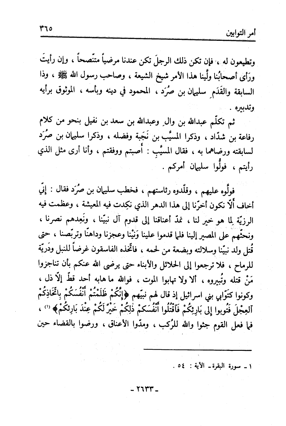 فولوه عَلَيْهِم، وقلدوه رئاستهم، فخطب سُلَيْمَان بْن صرد فَقَالَ: إني أخاف ألا نكون أخرنا إِلَى هَذَا الدهر الَّذِي نكدت فِيهِ المعيشة، وعظمت فِيهِ الرزية لما هُوَ خير لنا، نمد أعناقنا إِلَى قدوم آل نبينا، ونعدهم نصرنا، ونحثهم عَلَى المصير إلينا فلما قدموا عَلَيْنَا ونينا وعجزنا وداهنا وتربصنا، حَتَّى قتل ولد نبينا وسلالته وبضعة من لحمه، فأتخذه الفاسقون غرضا للنبل ودرية للرماح، فلا ترجعوا إِلَى الحلائل والأبناء حَتَّى يرضى اللَّه عنكم بأن تناجزوا من قتله وتبيروه، ألا ولا تهابوا الموت، فو الله مَا هابه أحد قط إلا ذل، وكونوا كتوابي بَنِي إسرائيل إذ قَالَ لَهُمْ نبيهم إِنَّكُمْ ظَلَمْتُمْ أَنْفُسَكُمْ بِاتّخَاذِكُمْ العِجْل فَتُوبوا إِلى بَارِئكُمْ فَاقْتُلُوا أَنْفُسَكمْ ذلِكُم خَيْرٌ لَكُمْ عِنْدَ بَارِئكُمْ [1] ، فَمَا فعل الْقَوْم جثوا والله للركب، ومدوا الأعناق، ورضوا بالقضاء حين
